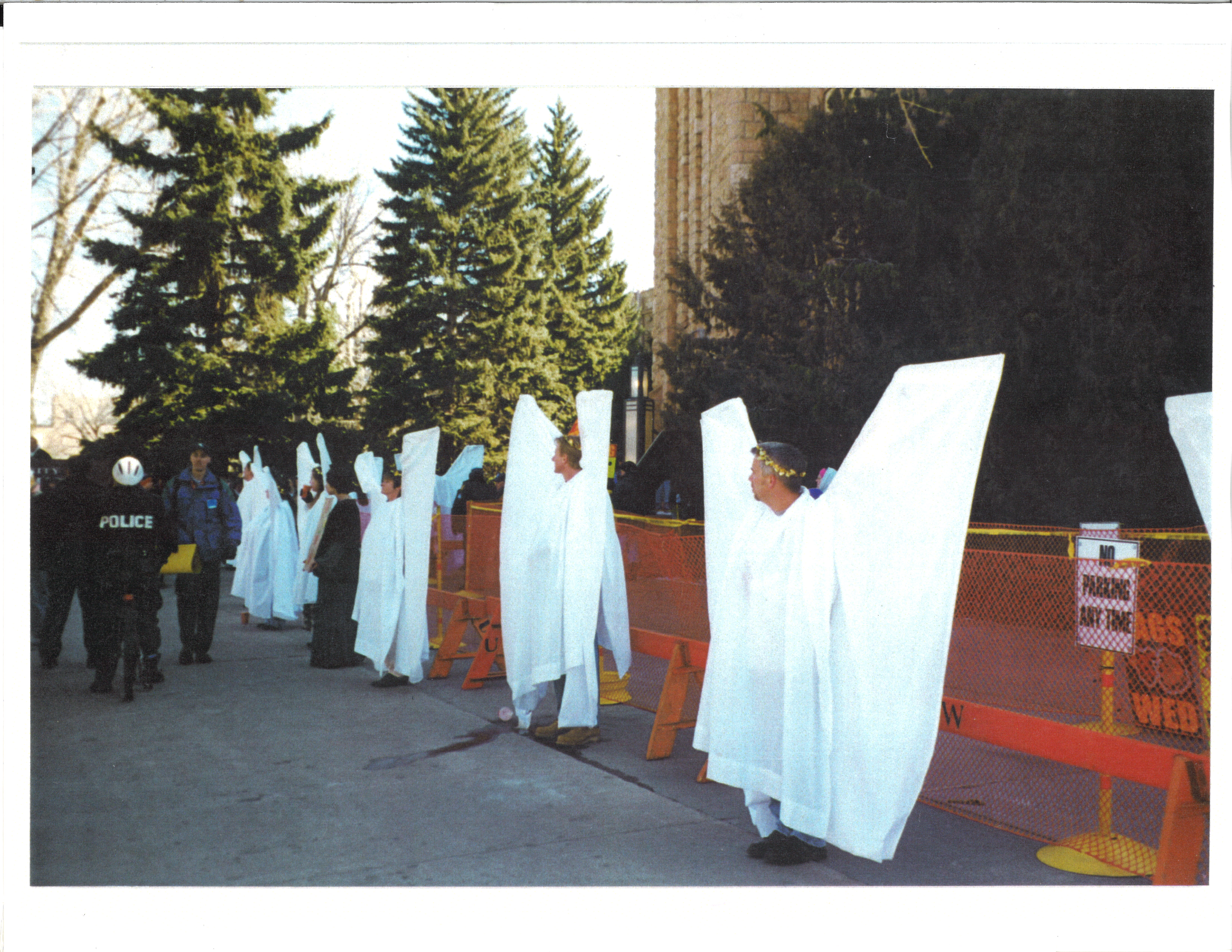 Supporters of Matthew Shepard's family dressed as angels stand silently to block hateful anti-gay protesters from the Westboro Baptist Church.