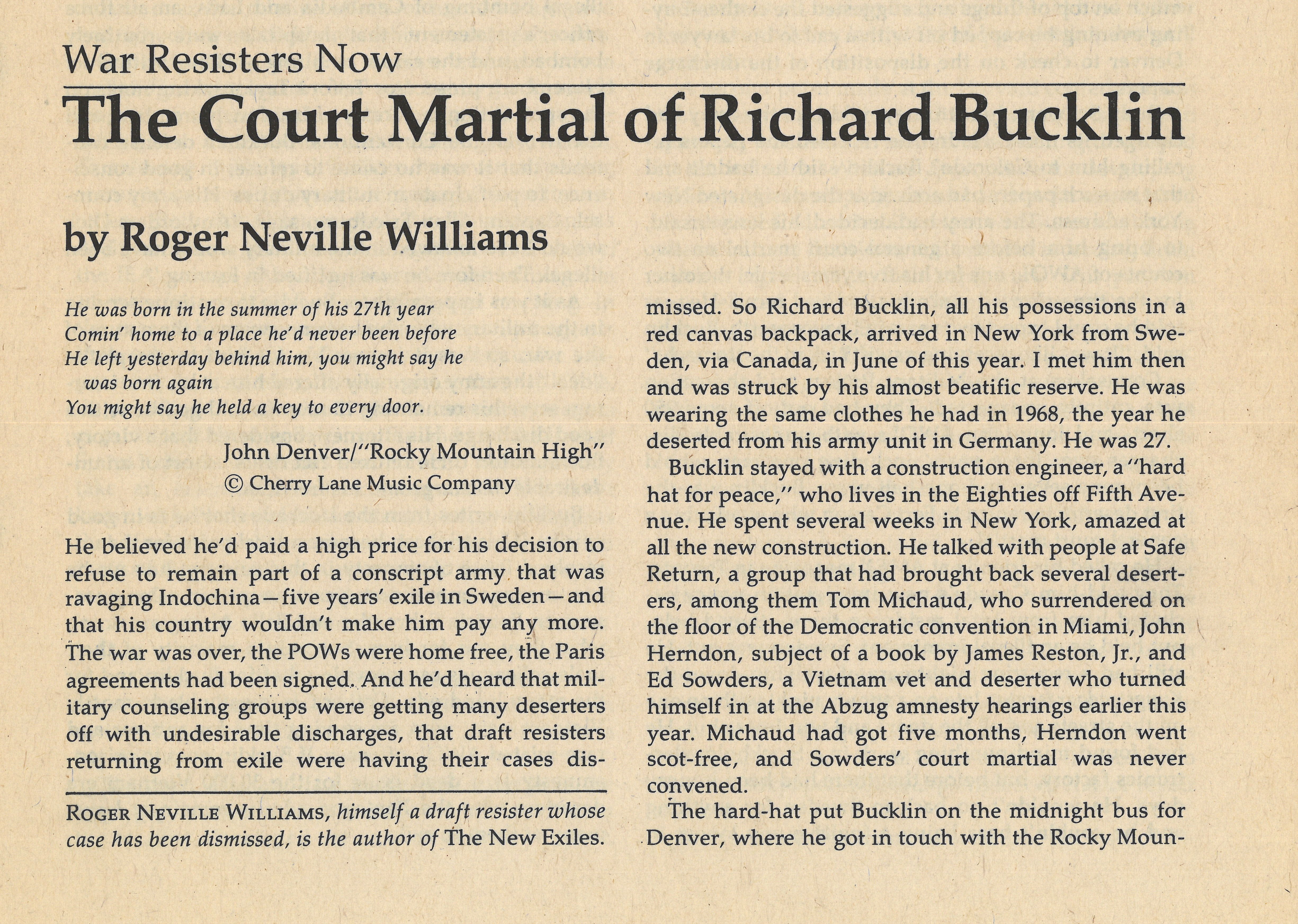 Richard Bucklin deserted the U.S. Army in 1968 because he believed the Vietnam War was wrong. He lived in exile in Sweden for five years before turning himself in, expecting only a discharge. At first the Army seemed ready to release him, but then reversed its decision and put him on trial, charging him with being absent without leave (AWOL). Bucklin’s case became significant because his lawyers argued he was justified in refusing to fight in an illegal war.