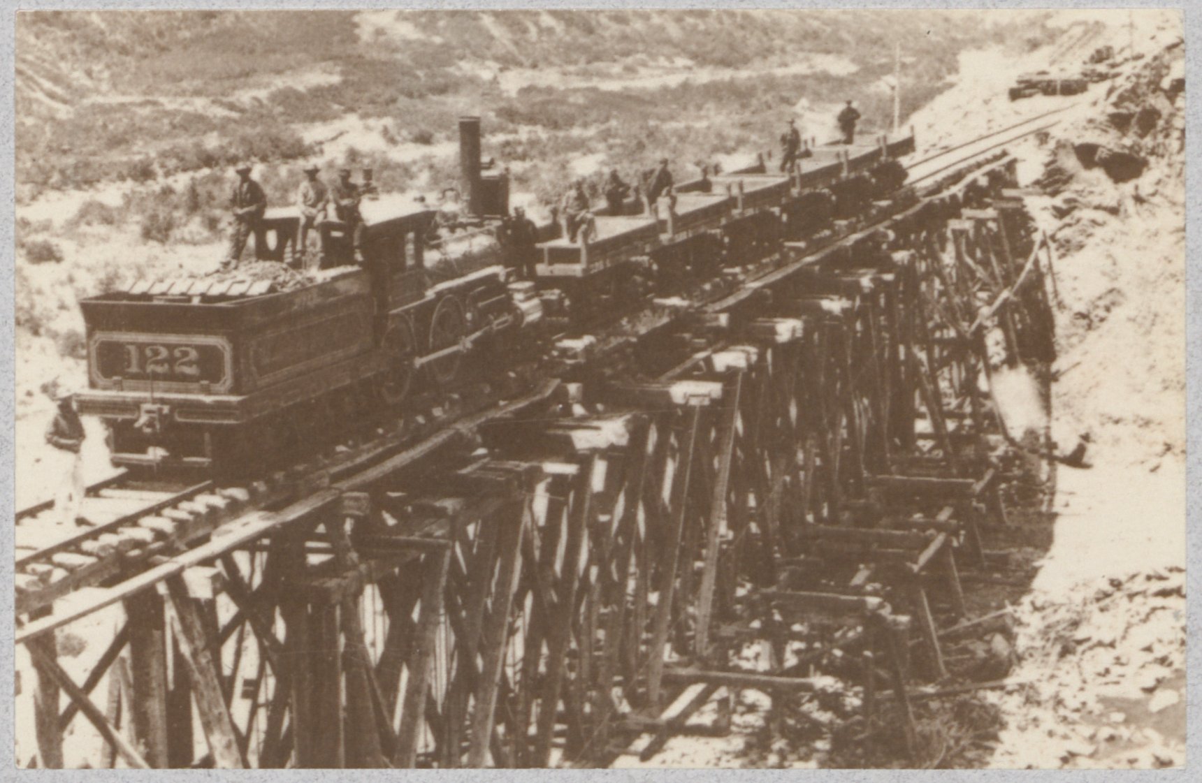 The Devil's Gate Bridge in Weber Canyon, Utah, with a work train, 1869.