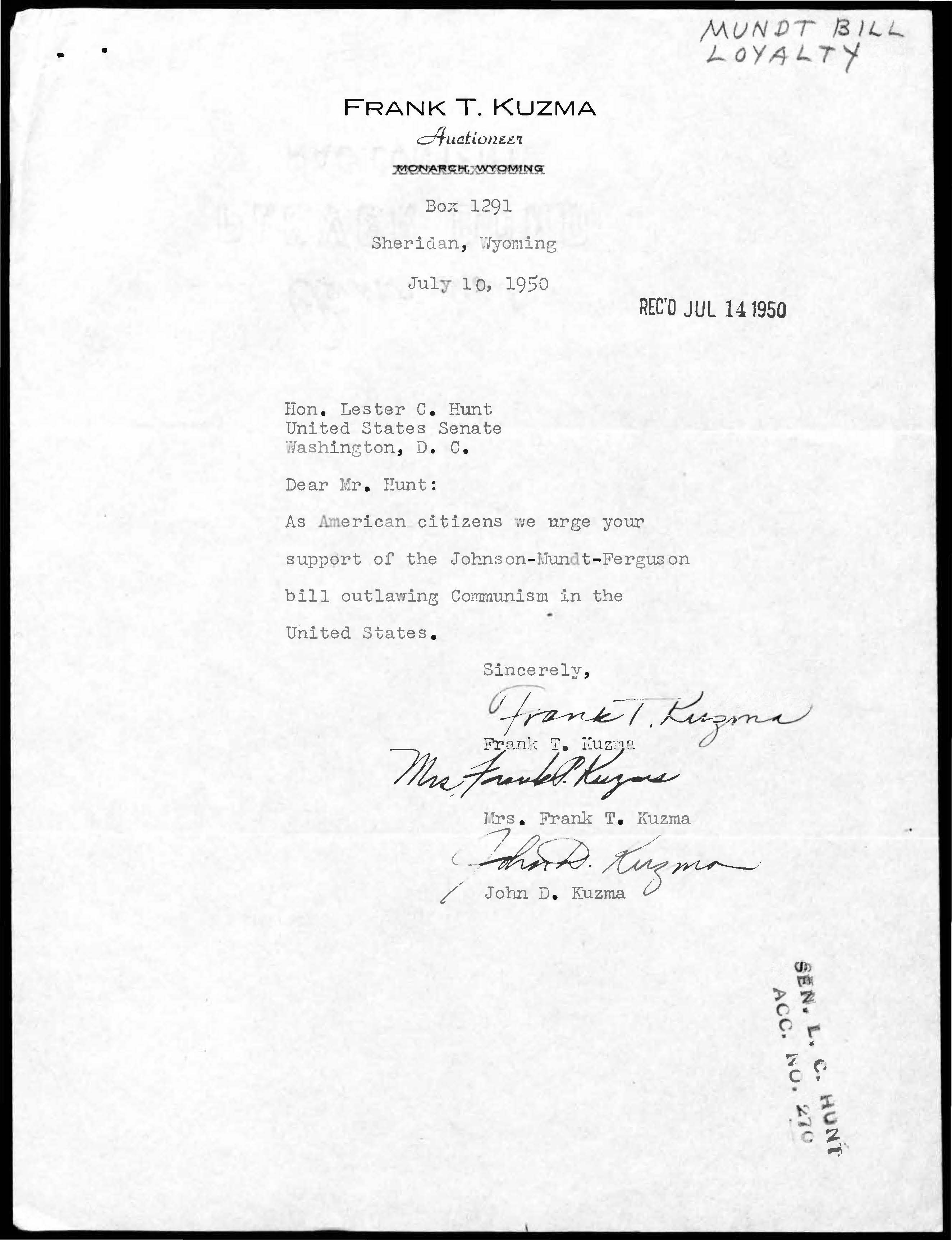 The Kuzma family writes in support of the Mundt-Ferguson Bill as American citizens. Senator Hunt is pleased to see that his constituents are interested in national matters and alert to what is going on.