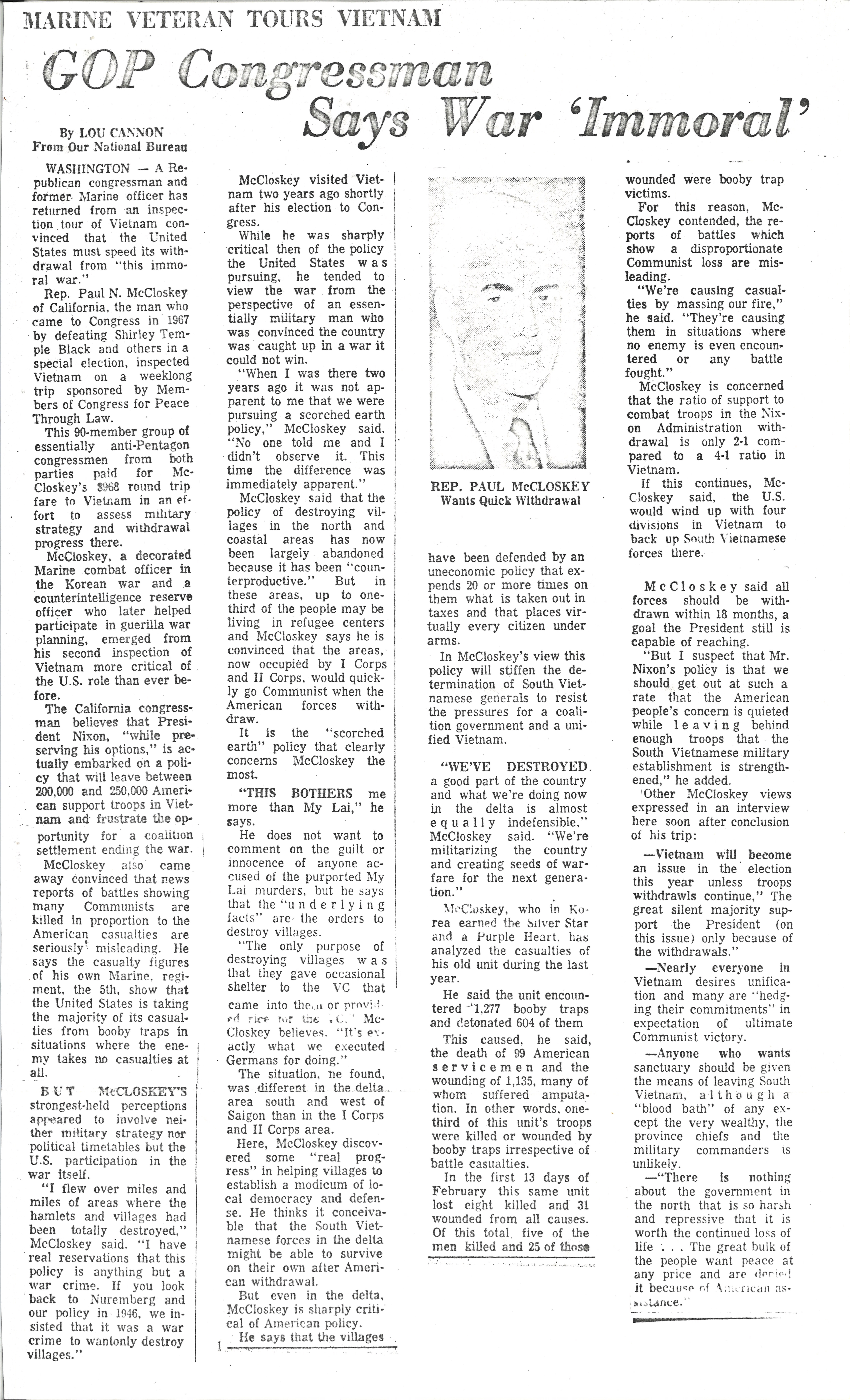Congressman Paul N. McCloskey, a decorated Marine veteran, returned from a fact finding tour of Vietnam calling the war “immoral” and urging the U.S. to withdraw quickly. He argued that the policy of destroying villages and using heavy firepower was causing huge civilian suffering. McCloskey believed the U.S. was fueling endless war and said America should focus on peace negotiations and helping South Vietnam govern itself.