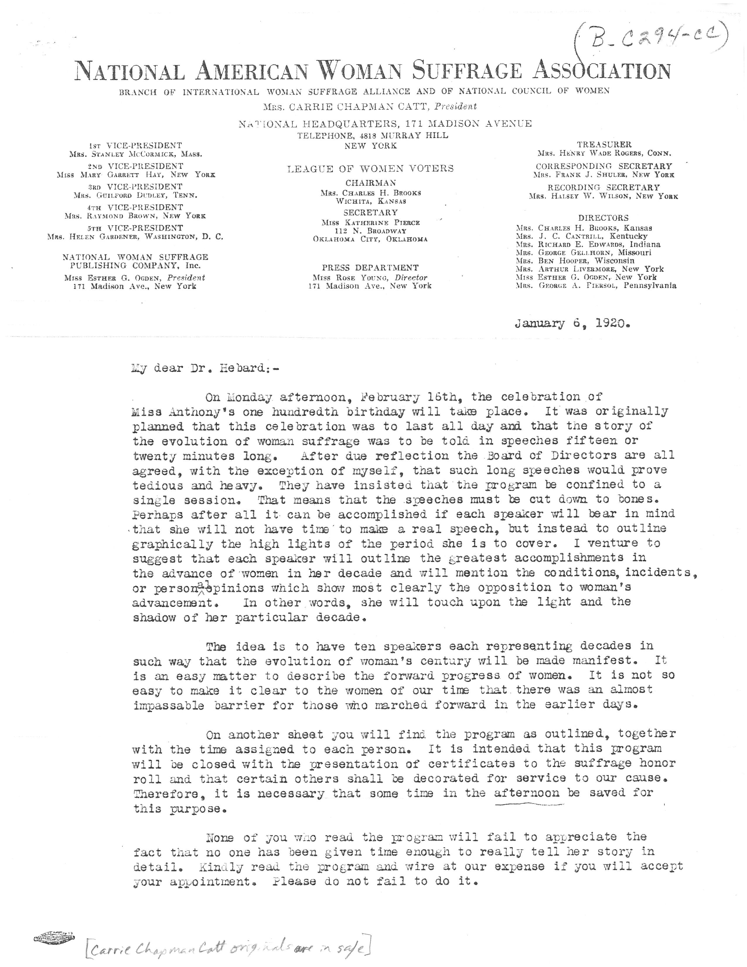 Hebard is to be one of the national speakers at a celebration honoring Susan B. Anthony's 100th birthday. From the letter one gathers that the NAWSA Board of Directors has overridden President Catt on the length of time each presenter can speak.