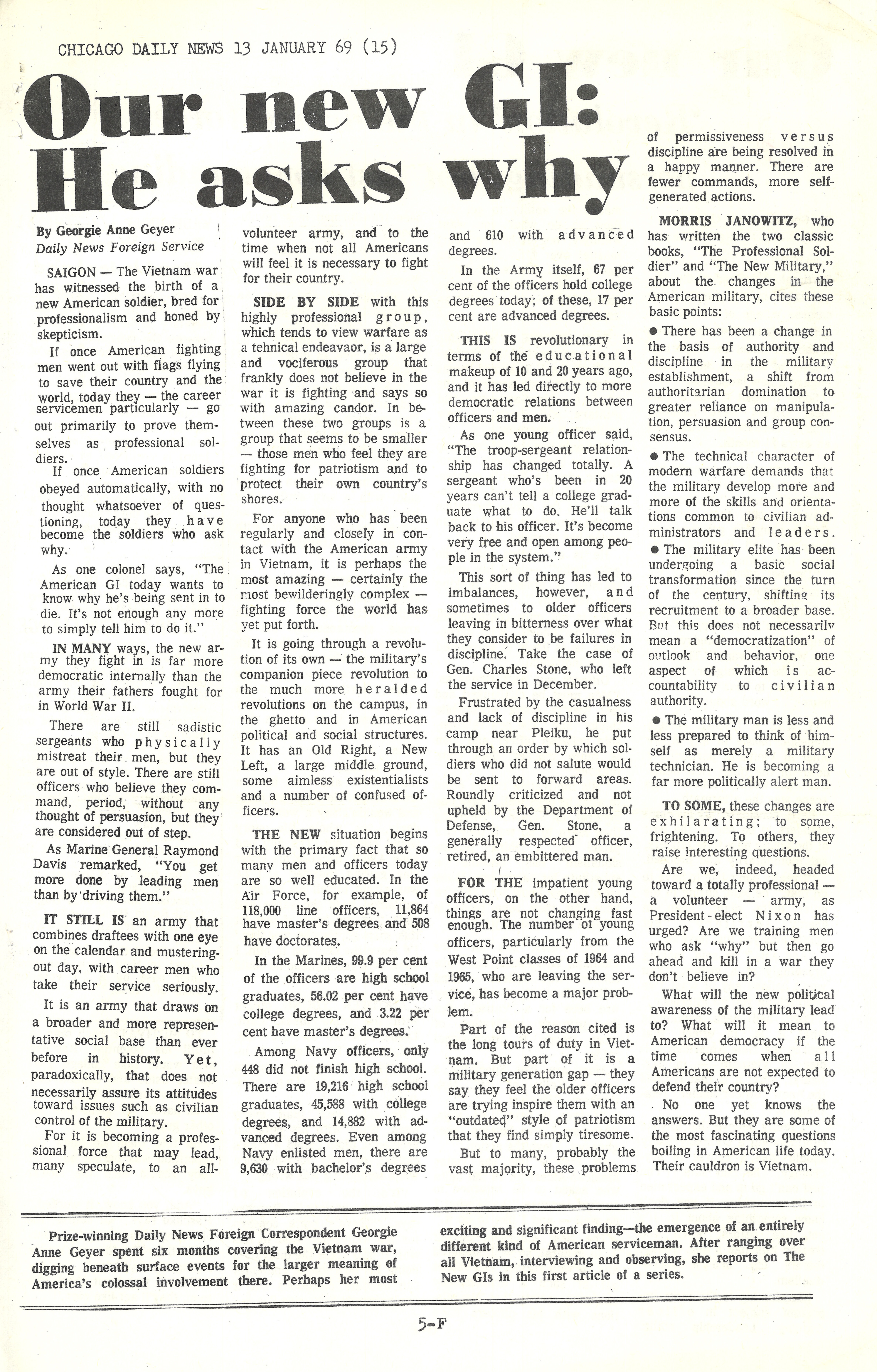 "Our New GI: He Asks Why" by Georgie Anne Geyer, Chicago Daily News, January 13, 1969