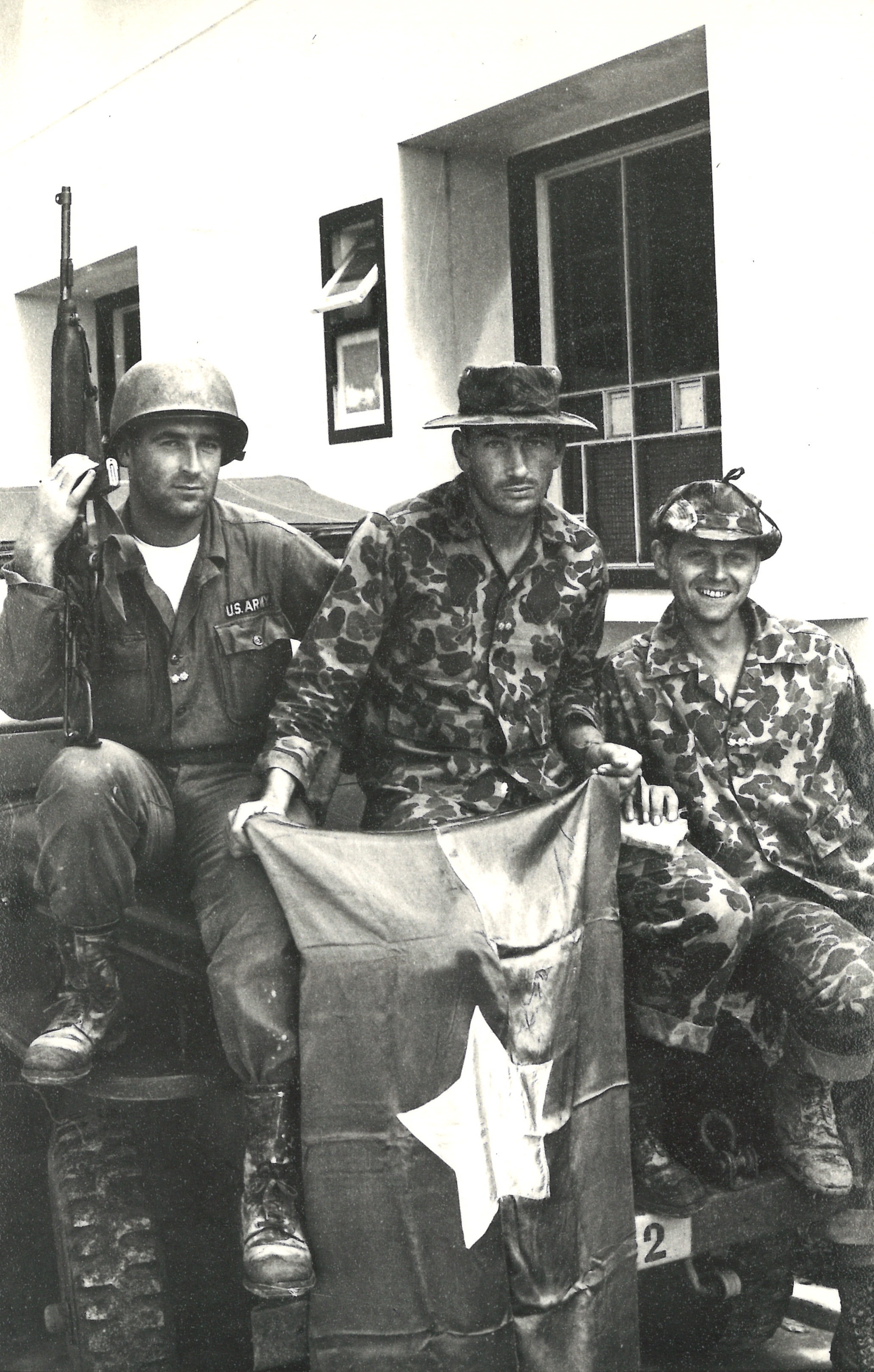 Three American infantry advisors pose with a captured Viet Cong communist flag after an assault operation against Viet Cong guerrillas. They are pictured outside their barracks, where they stay when they are not out on assault operations in the high mountain jungles.