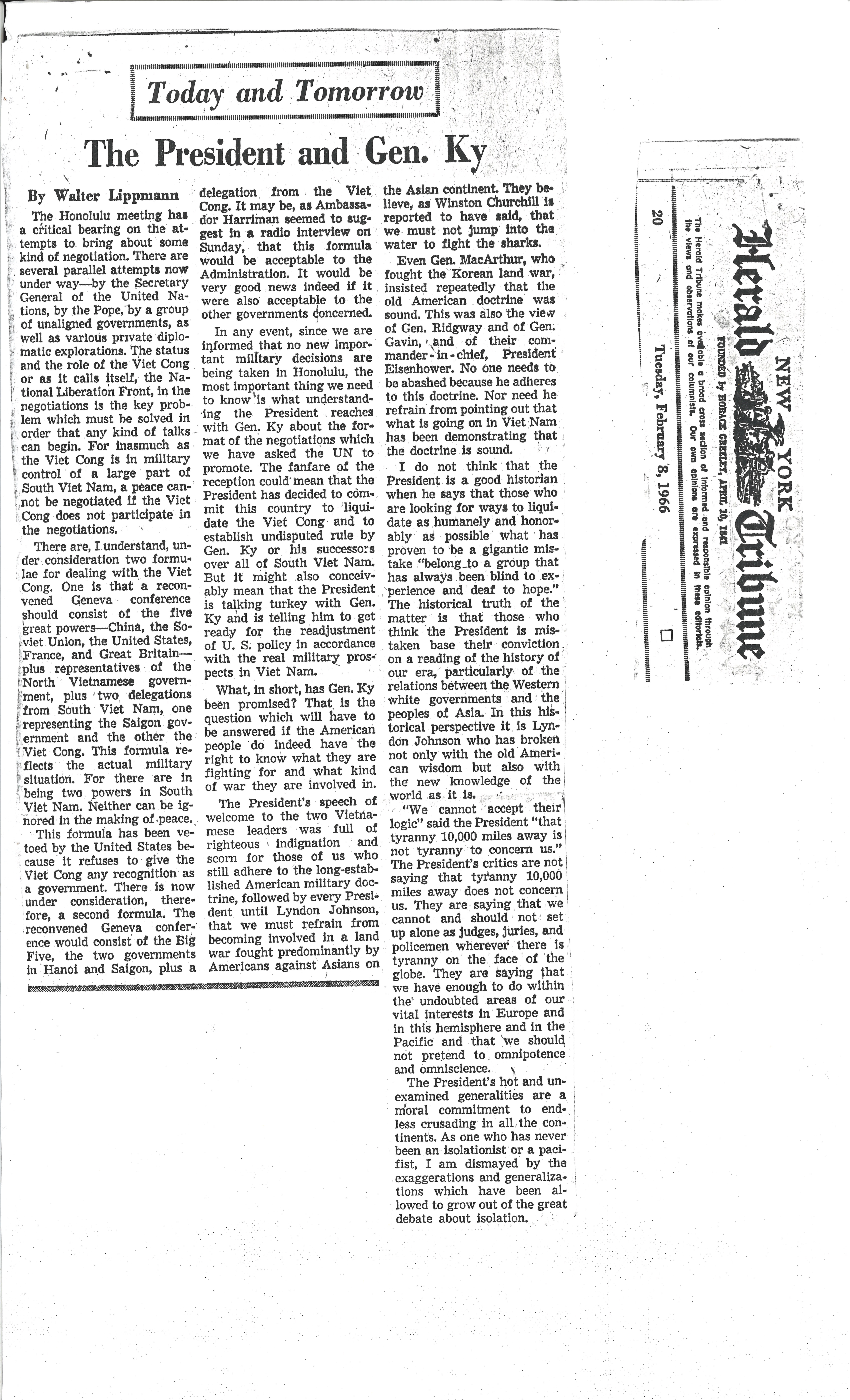"The President and Gen. Ky" by Walter Lippmann, New York Herald Tribune, February 8, 1966