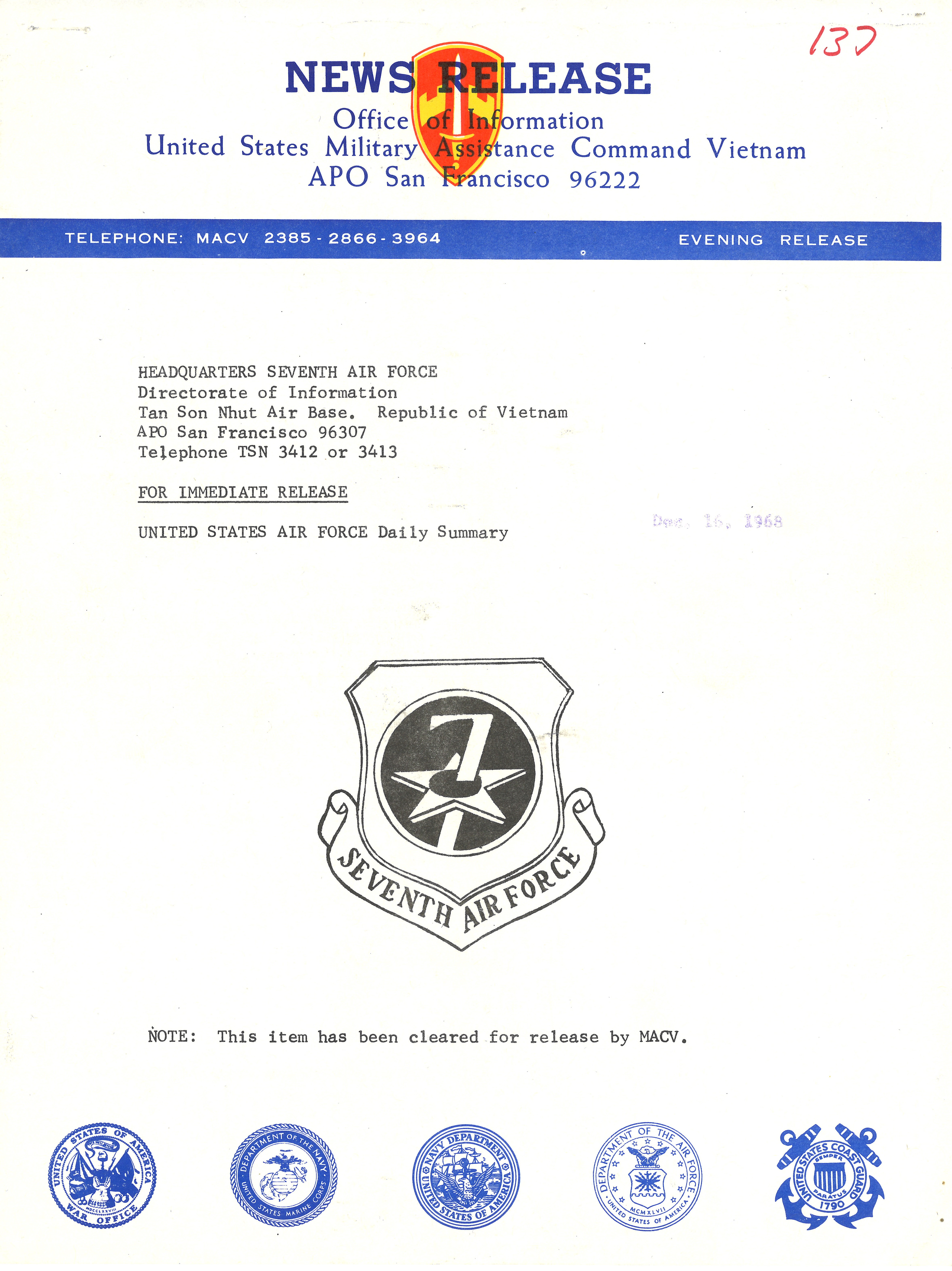 This news release is representative of those issued daily by the U.S. Air Force during the Vietnam War. It details attacks on enemy locations in South Vietnam. Similar news releases were issued by the U.S. Army and U.S. Navy.