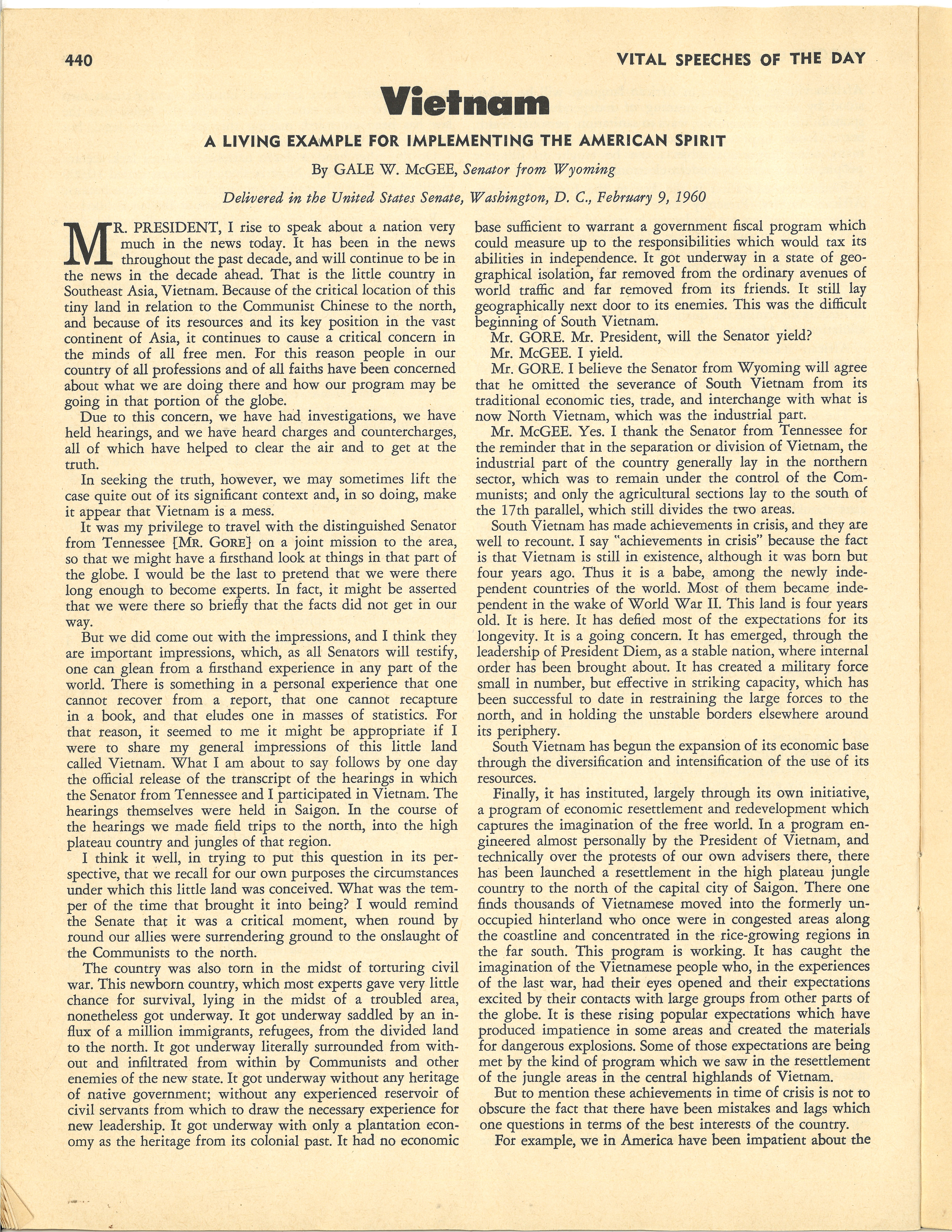 This speech, titled "Vietnam - A Living Example for Implementing the American Spirit", was delivered on the floor of the U.S. Senate. In it, Senator McGee described his observations about South Vietnam based on his recent visit to the country. He spoke of a young but determined nation, struggling against communism while trying to build stability, an economy, and hope for its people. He urged Americans to support Vietnam not just with military aid, but also with long-term economic and social programs.
