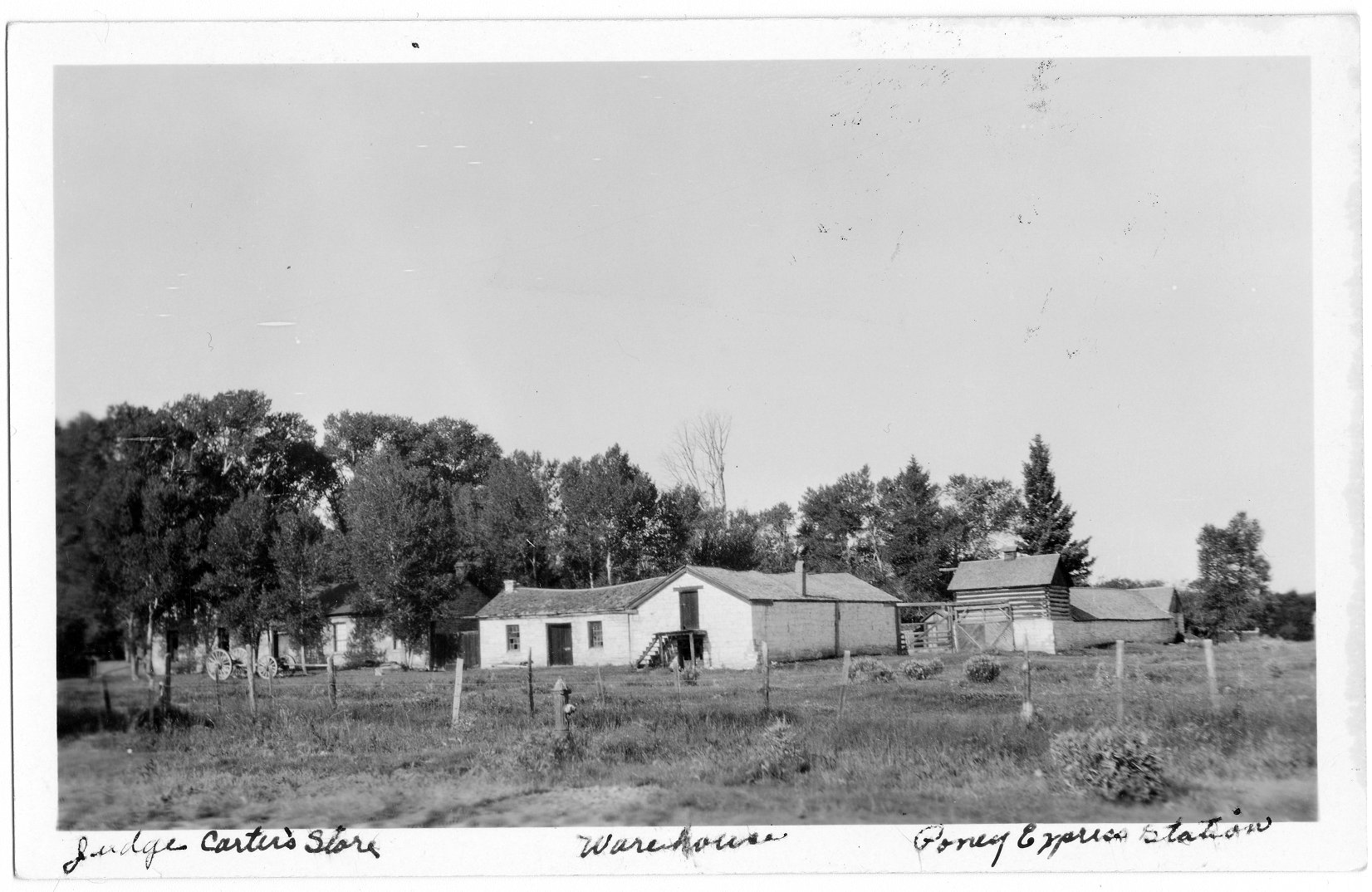 Postcard of Fort Bridger sutler's store in what is now Uinta County, Wyoming. Written on the front of the postcard is "Judge Carter's Store, Warehouse, Pony Express Station." Written on the back of the postcard is "Old heavy army freighting wagon. At right-Pony Express station and stables."