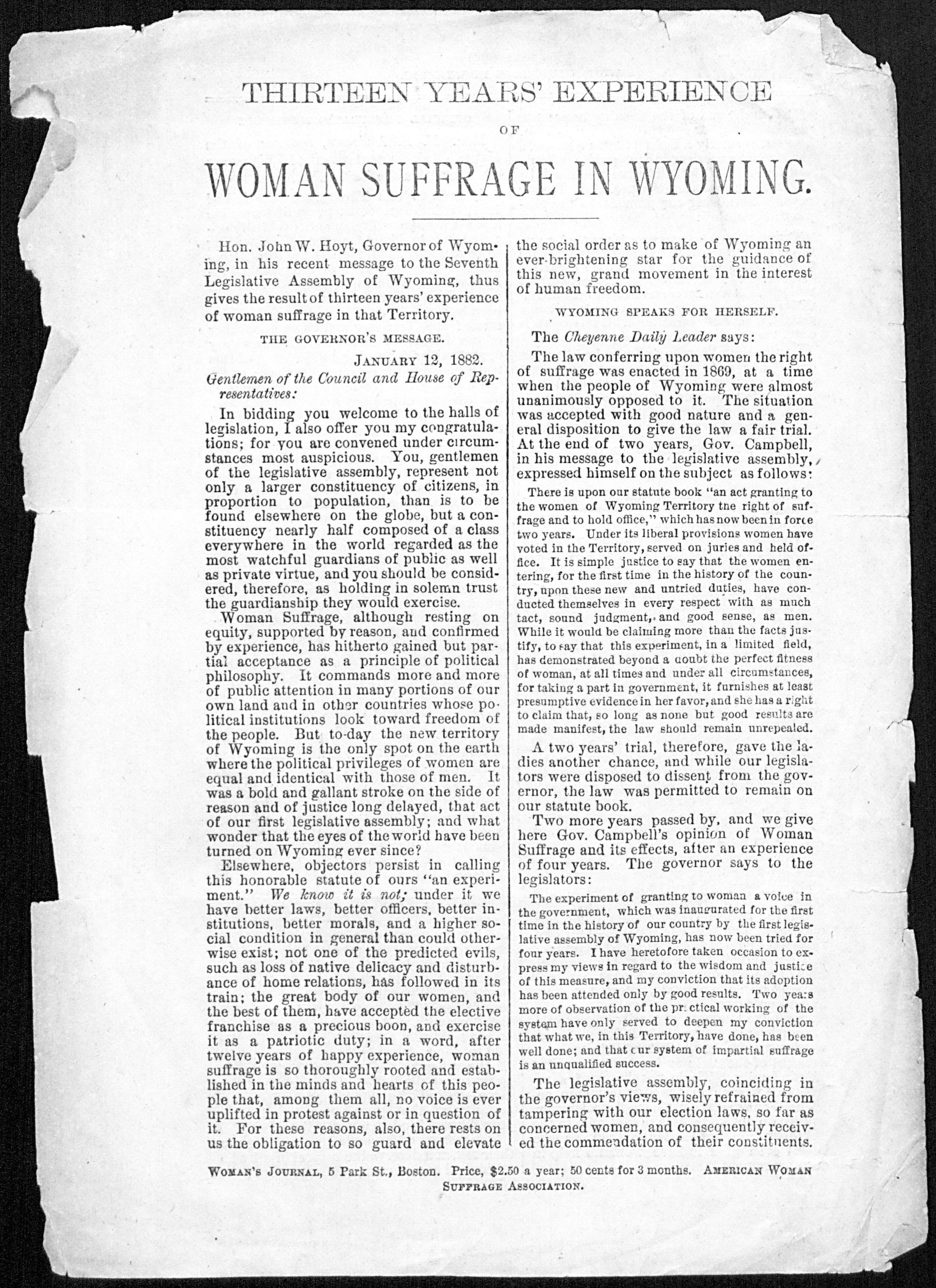 "Thirteen Years' Experience of Woman Suffrage in Wyoming," Woman's Journal, American Woman Suffrage Association, 1882
