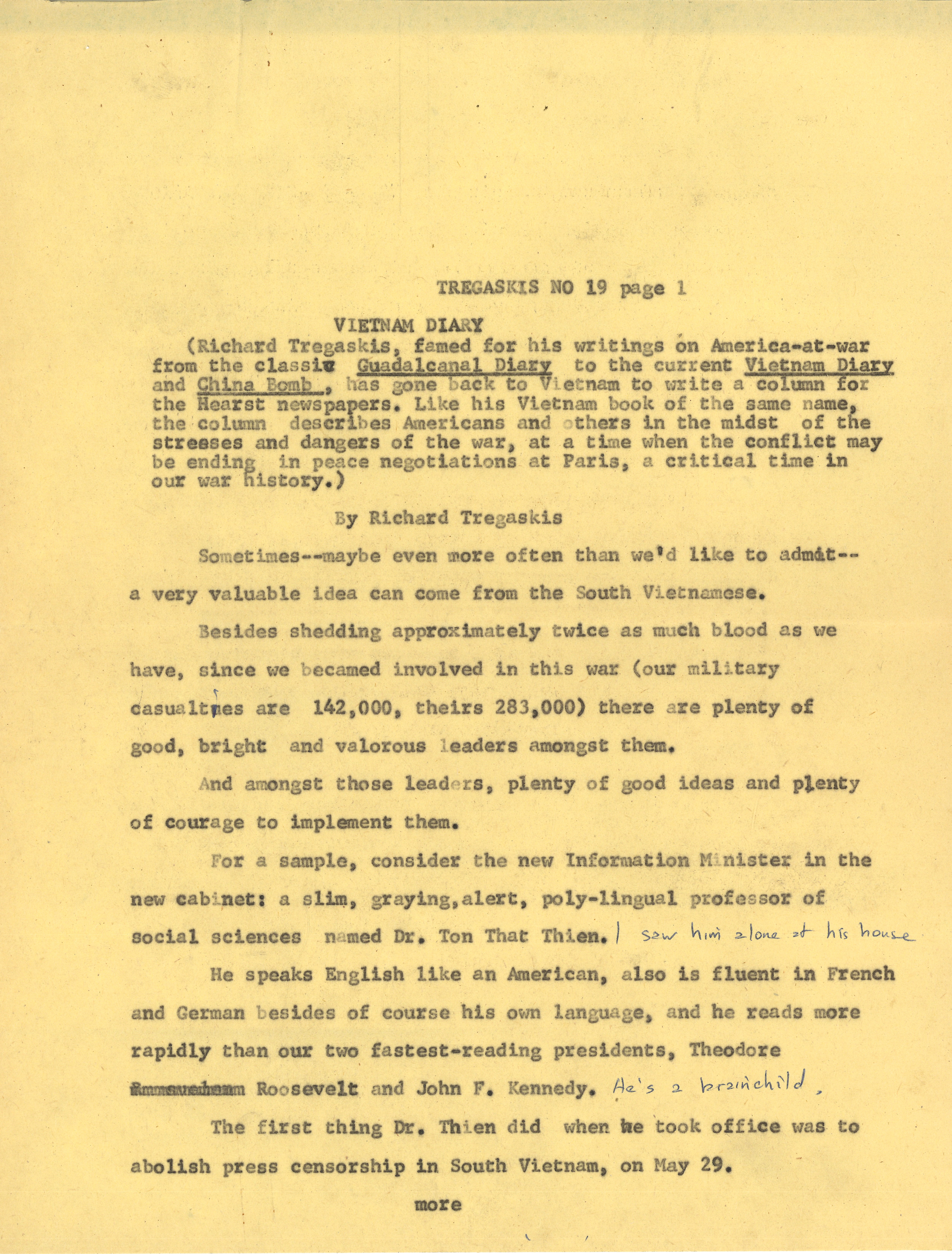 In this draft article, Tregaskis writes about South Vietnam’s new Information Minister, Dr. Ton That Thien, who values freedom of the press as essential to democracy. Dr. Thien, a multilingual professor, abolished press censorship soon after taking office and believes that open media helps people change their government without violence. While acknowledging flaws in South Vietnam’s press, he argues that mature societies accept that newspapers can make mistakes and should remain free from governmental control.