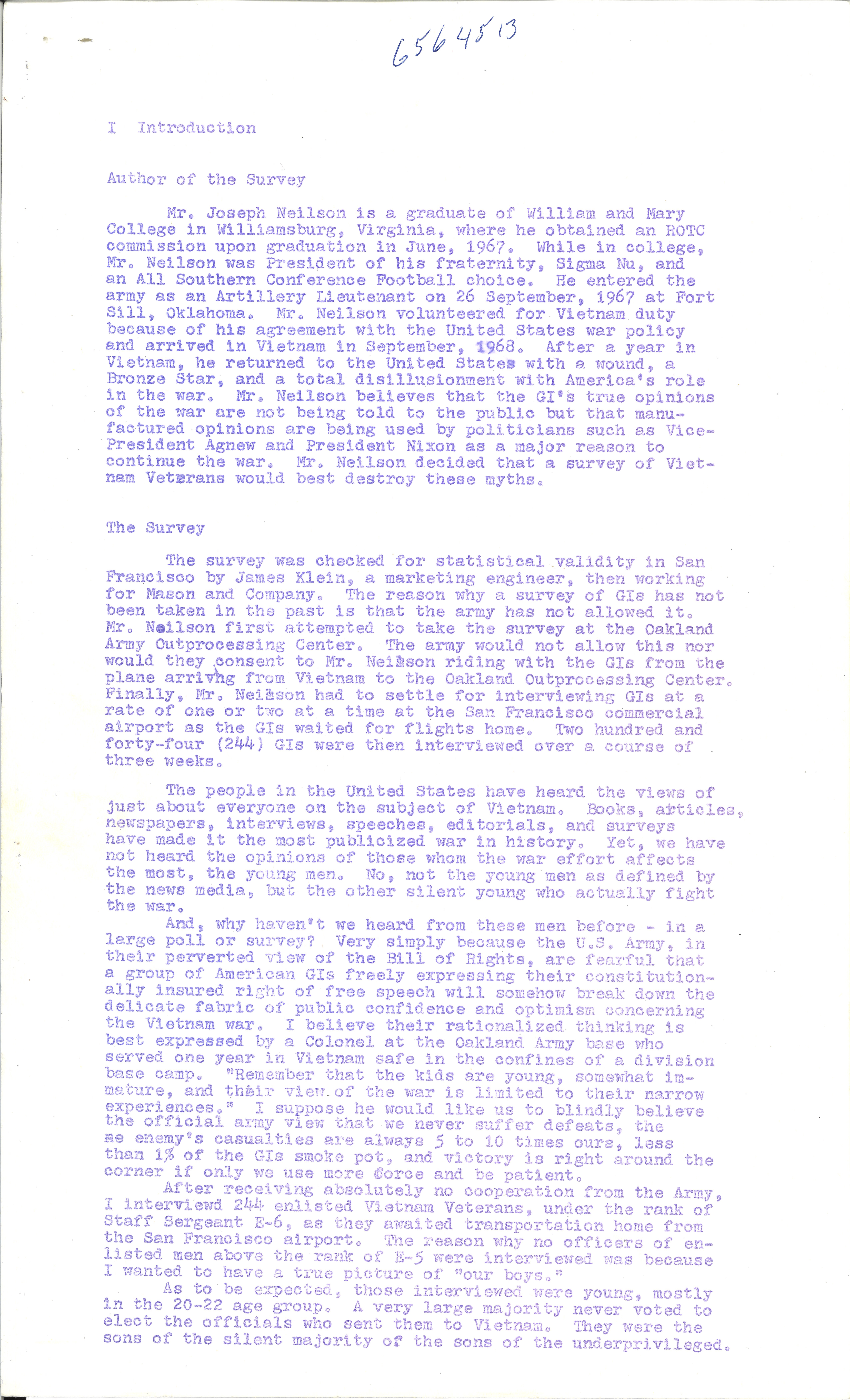 This document is the analysis of a survey conducted with 244 U.S. soldiers returning from Vietnam to understand their views on the war. Most soldiers reported that the war had mixed or negative effects on them. Many felt the South Vietnamese were more interested in survival than fighting, and nearly 40% of soldiers believed the U.S. made a serious mistake entering the war.