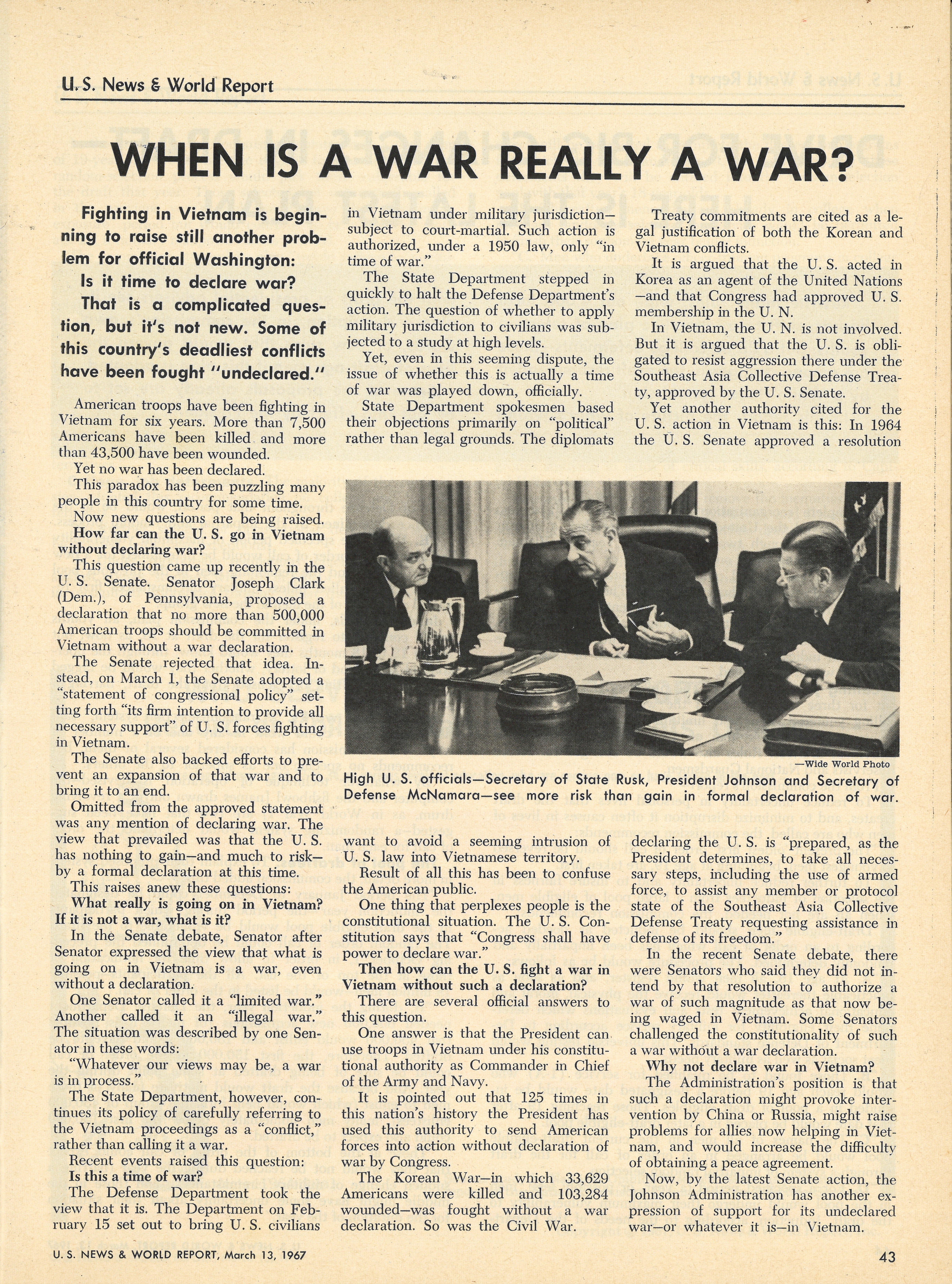 "When Is A War Really A War?", U.S. News & World Report, March 13, 1967