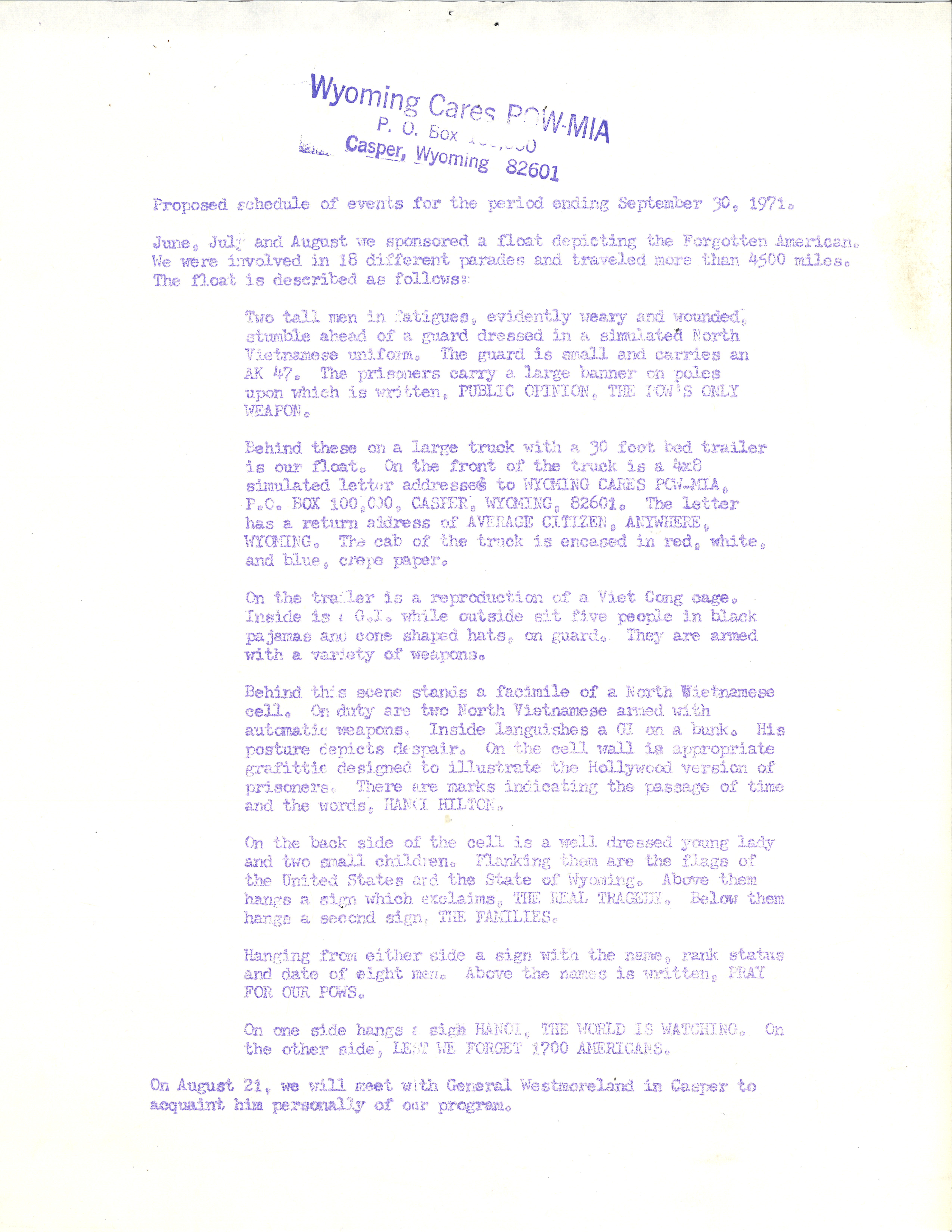 This document describes in detail the parade float created in Wyoming to depict the plight of American prisoners of war in Southeast Asia. The float was involved in 18 different parades and traveled more than 4500 miles. It was a graphic and effective way of raising awareness about the prisoners of war and missing in action.