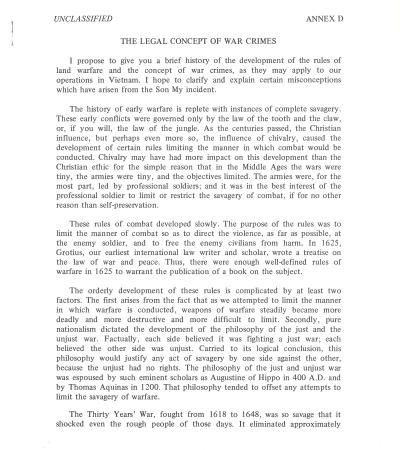 This document explains the historical development and modern understanding of war crimes, focusing on how laws of warfare evolved to limit unnecessary suffering and protect civilians. It reviews historical examples—showing how accountability for atrocities shifted from nations to individual soldiers and commanders. The text emphasizes that military leaders must act responsibly to prevent and investigate war crimes, even amid the challenges of modern conflicts like Vietnam.