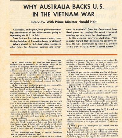 This magazine article covers an interview with Australian Prime Minister Harold Holt who explains why Australia supports the United States in the Vietnam War. Holt says that Australia’s safety depends on keeping Southeast Asia stable and that the U.S. fight in Vietnam helps protect freedom throughout the region.
