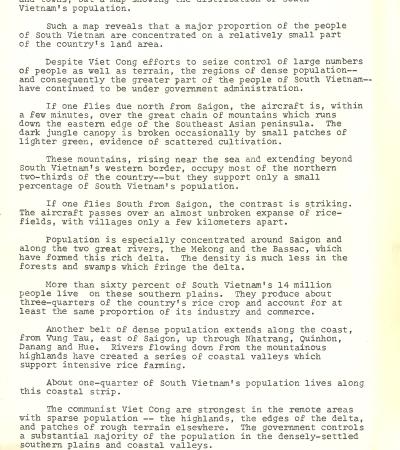 The article explains that the real fight in Vietnam was over control of the people rather than just land. It describes how most of South Vietnam’s population lived in the southern plains and coastal areas, which remained mostly under government control, while the Viet Cong held sparsely populated regions like the highlands. Despite gaining some territory, the Viet Cong had, as of the time the article was written, failed to capture large towns or dense population centers.