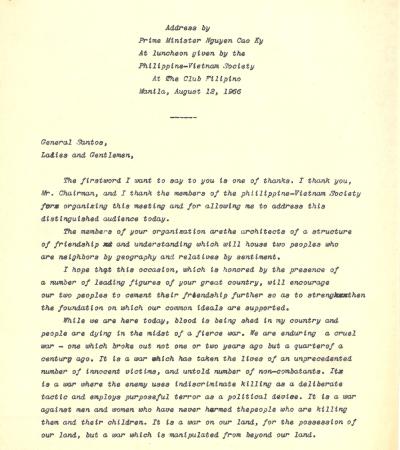 Address by Nguyễn Cao Kỳ, Prime Minister of South Vietnam, To The Philippine-Vietnam Society, August 12, 1966