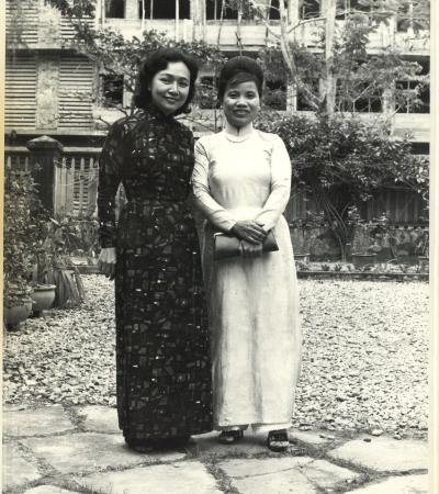 Lam My Bach Tuyet (left) and Agnes Nam (right) both own Vietnamese construction businesses and are military contractors. They have built base structures and housing for U.S. Army and Marine detachments in Dananag, Vietnam. Behind them is the half-finished International Hotel which Tuyet is building to house U.S. Army officers.