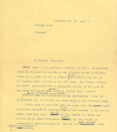 In this draft article, Tregaskis reflects on General Westmoreland’s leadership in Vietnam, noting his military successes in pushing back the enemy but also how the Tet Offensive’s portrayal in the American press turned that victory into a perceived defeat. He goes on to explain that while U.S. and South Vietnamese forces made steady gains, the lack of strong propaganda and public relations allowed enemy narratives to overshadow battlefield results.