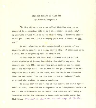 In this draft article, Tregaskis writes about South Vietnam’s new Information Minister, Dr. Ton That Thien, who values freedom of the press as essential to democracy. Dr. Thien, a multilingual professor, abolished press censorship soon after taking office and believes that open media helps people change their government without violence. While acknowledging flaws in South Vietnam’s press, he argues that mature societies accept that newspapers can make mistakes and should remain free from governmental control.