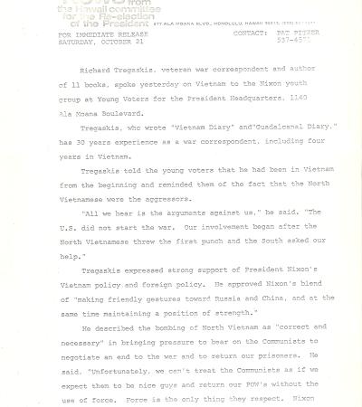This press release covers Richard Tregaskis' speech to a Nixon Young Voters group. Tregaskis supported President Nixon's Vietnam policy and foreign policy, including the bombing of North Vietnam.