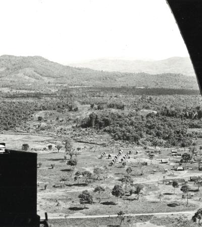 This helicopter eye's view shows a Montagnard village, where the houses are raised on stilts. A U.S. Army special force detachment of 14 men has trained a force of more than 200 Montagnards to protect the village. It is surrounded by Viet Cong territory.