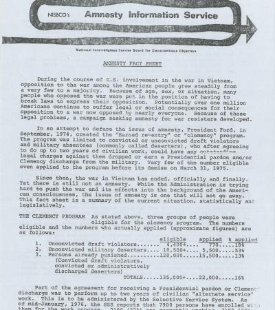 This fact sheet was published by the National Interreligious Service Board for Conscientious Objectors (NISBCO). Despite the official end of U.S. involvement in the Vietnam War, hundreds of thousands of draft violators and military deserters were still being punished. NISBCO argued for an unconditional amnesty program.