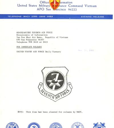 This news release is representative of those issued daily by the U.S. Air Force during the Vietnam War. It details attacks on enemy locations in South Vietnam. Similar news releases were issued by the U.S. Army and U.S. Navy.