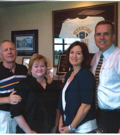 Dennis and Judy Shepard stand with Rulon Stacey and his wife next to a framed University of Wyoming Cowboy football jersey