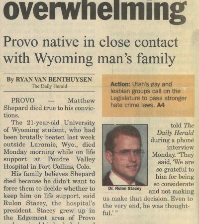 The article from a Provo, Utah paper discusses Matthew Shepard's beating, hospialization and death and the relationship Rulon Stacey developed with Matthew Shepard's parents.