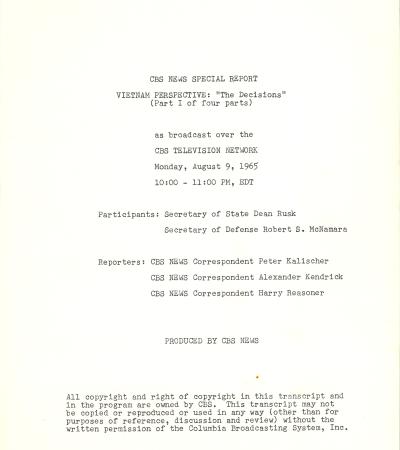 This transcript covers a CBS television broadcast interview with U.S. Secretary of State Dean Rusk and Secretary of Defense Robert S. McNamara. The discussion was focused on decisions made about the U.S. engagement in Vietnam. It provides insight into official government perspective on the Vietnam War as of August, 1965.