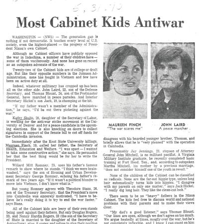 "Most Cabinet Kids Antiwar", San Francisco Examiner-Chronicle, May 31, 1970