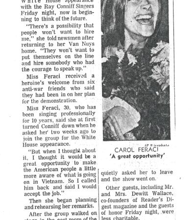This article describes how singer Carol Feraci protested the Vietnam War during a White House performance for President Nixon. While performing with the Ray Conniff Singers, she held up a sign reading “Stop the killing” and directly urged the president to end the bombing in Vietnam. Her bold protest shocked many guests and drew mixed reactions.