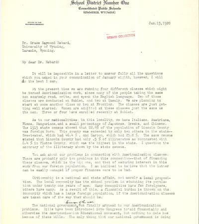 Early, the Superintendent of Sheridan Public Schools, replies to Hebard explaining what actions his school district has taken regarding citizenship classes for immigrants.