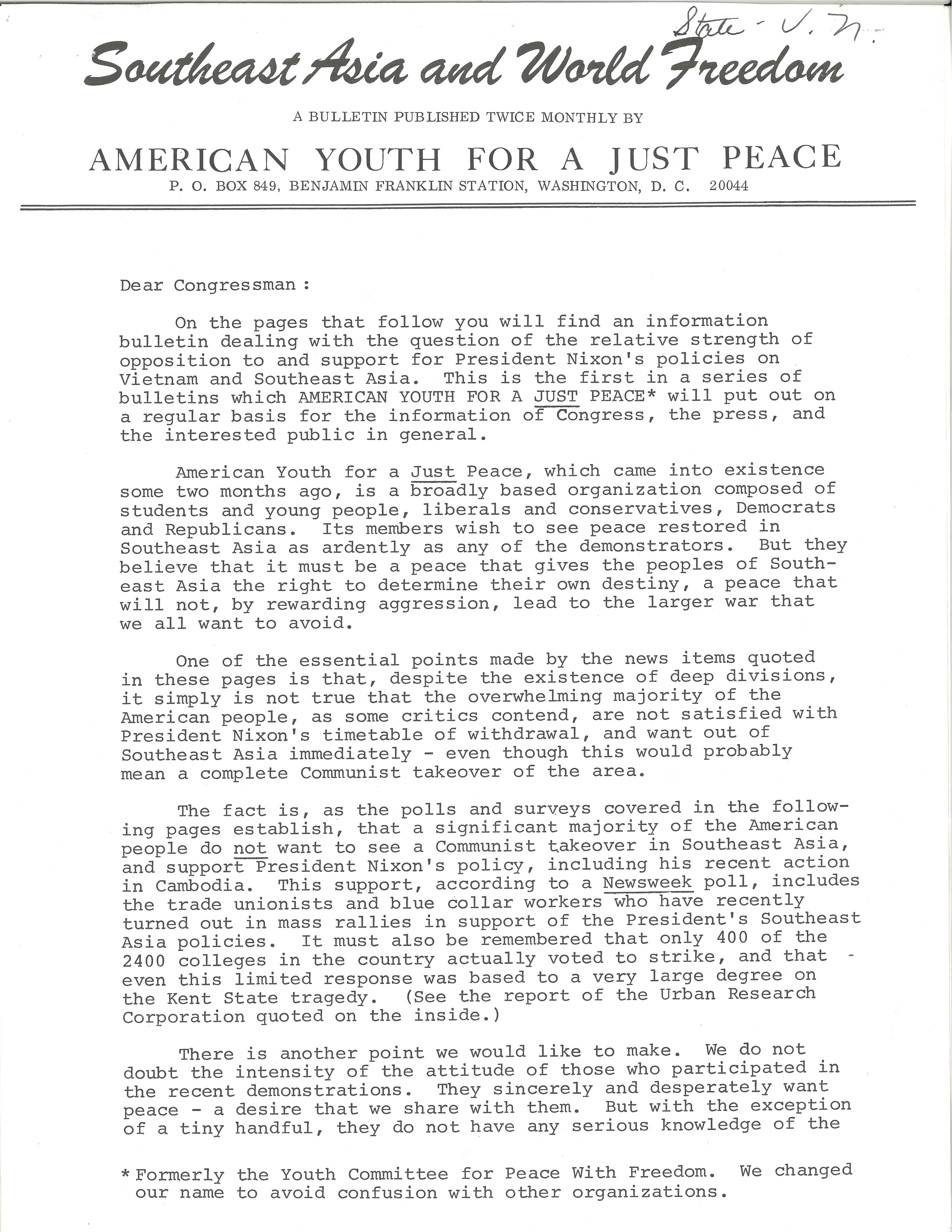 At a time when anti-war protests were raging and receiving widespread press coverage, this bulletin highlights instances of support for the Nixon administration's policies with respect to Vietnam and Southeast Asia.