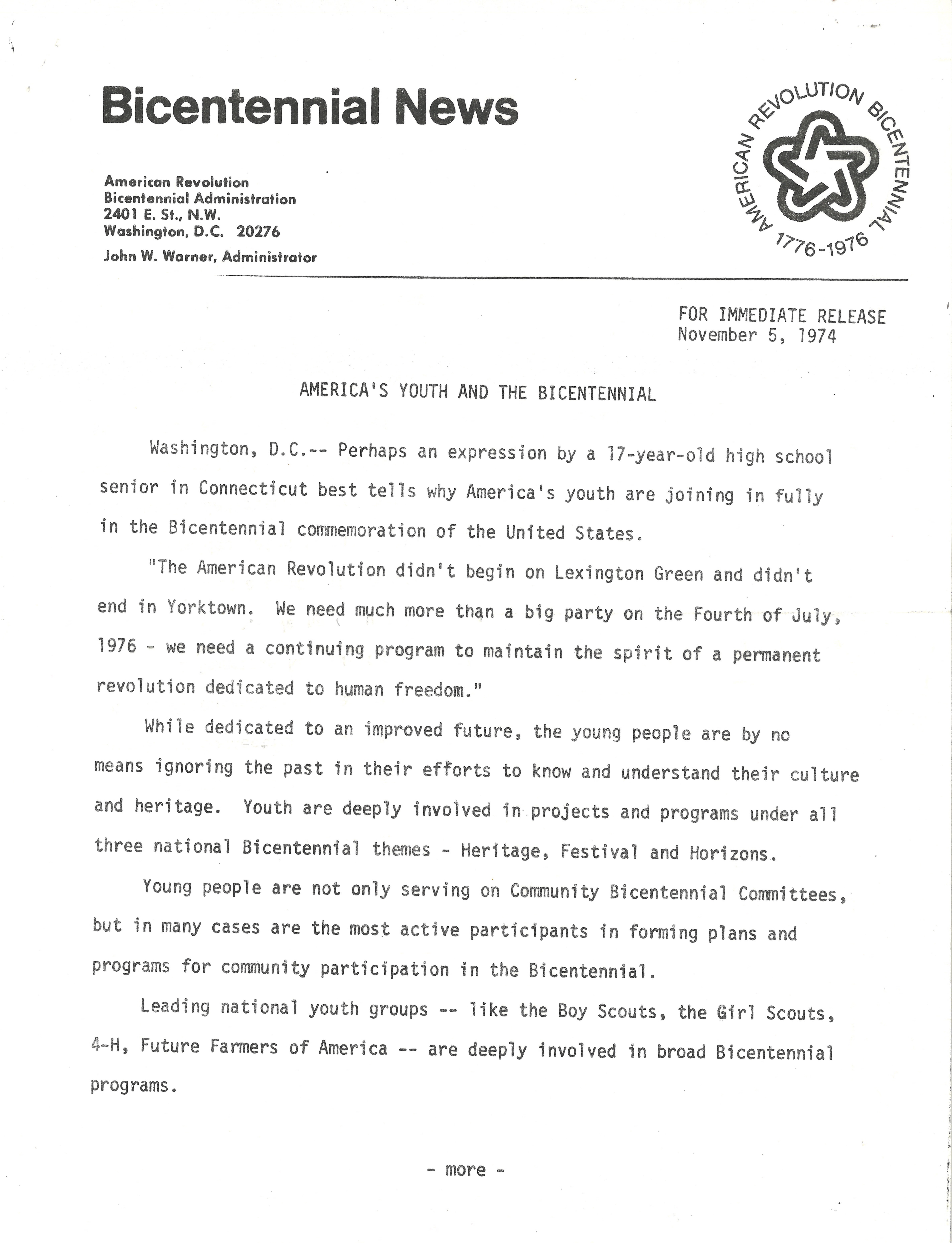 This press release from the American Revolution Bicentennial Administration highlights some of the Bicentennial programs and activities that have been planned by and for young people.