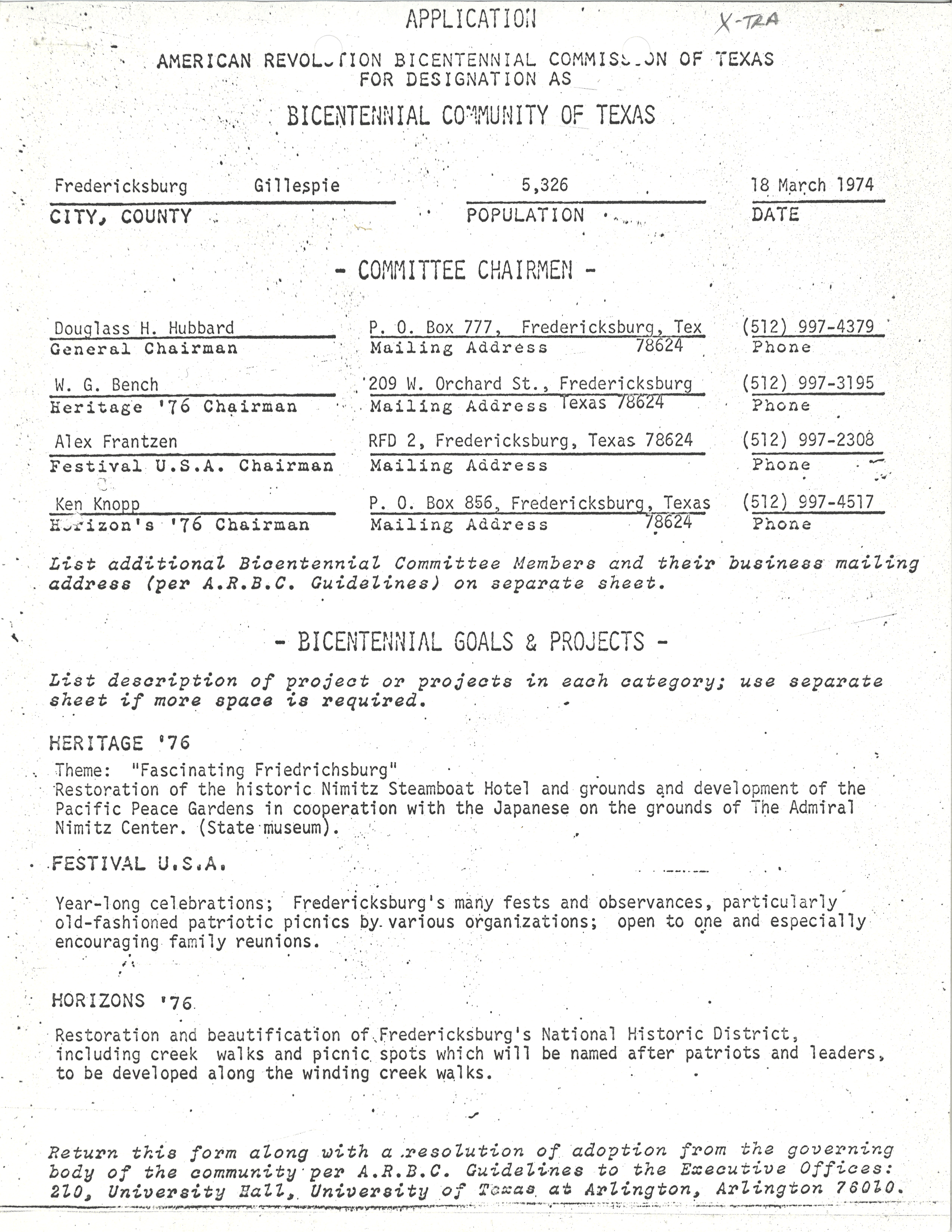 Communities small and large across the U.S. applied to their state American Revolution Bicentennial Commission to be designated as a Bicentennial Community. This application, from Fredericksburg, Texas, provides insight into the kinds of Bicentennial projects one small town was planning.