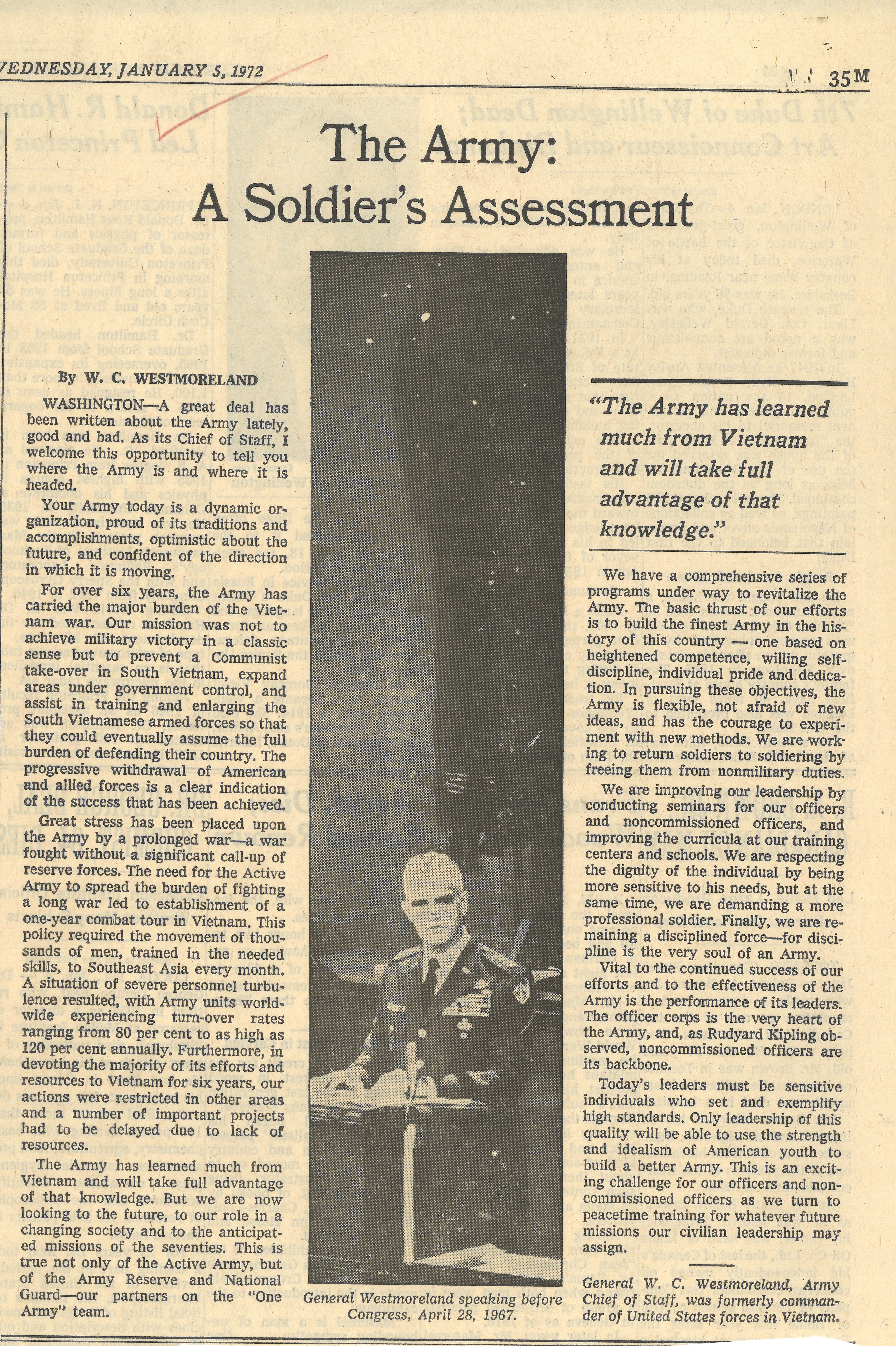 "The Army: A Soldier's Assessment" by W.C. Westmoreland, The New York Times, January 5, 1972