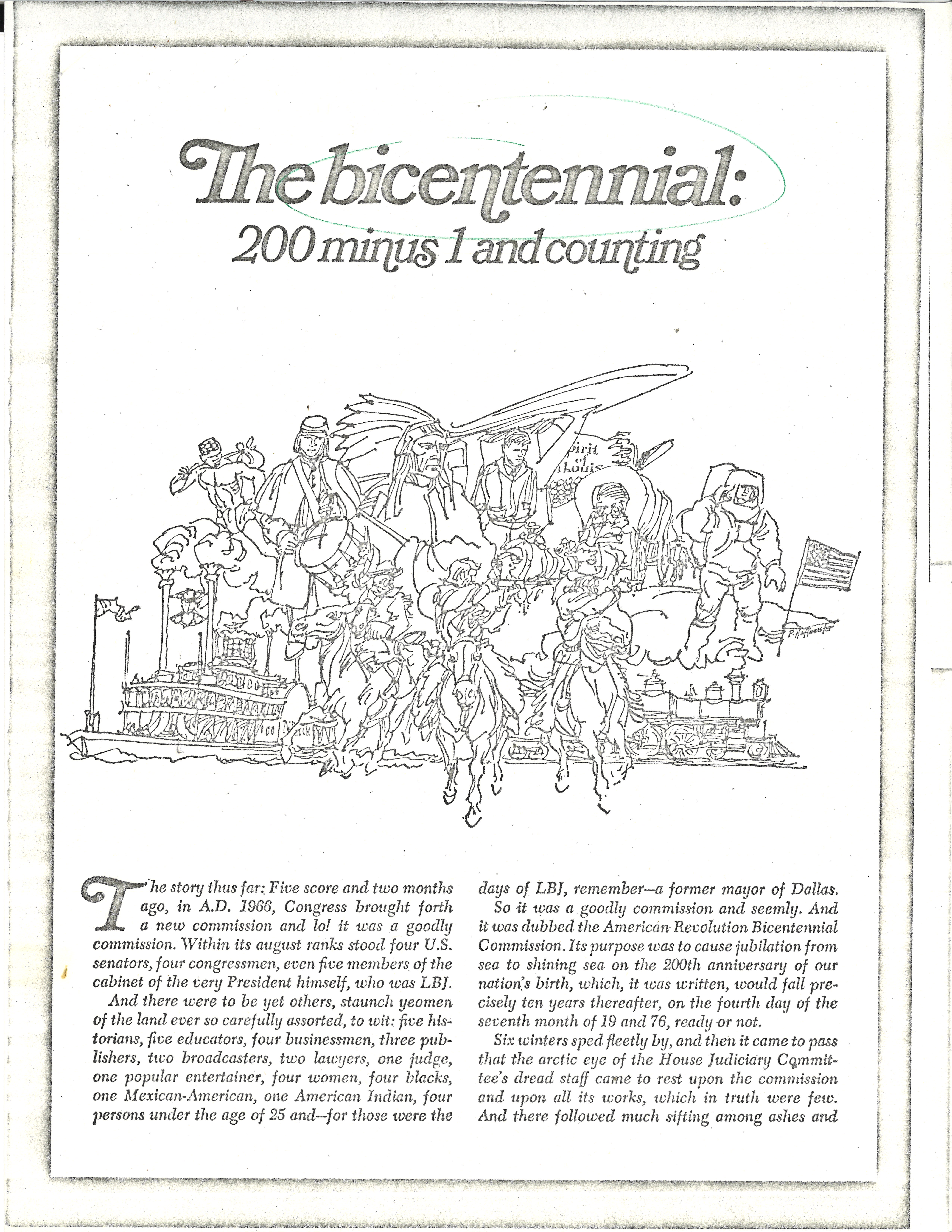 This humorous magazine article reflects on the chaotic start of the U.S. Bicentennial planning and the confusion over what the celebration should really honor—America’s endurance, revolution, or institutions. It highlights both official and grassroots efforts, from massive historical projects to quirky local events, and encourages individuals to celebrate in their own meaningful way.