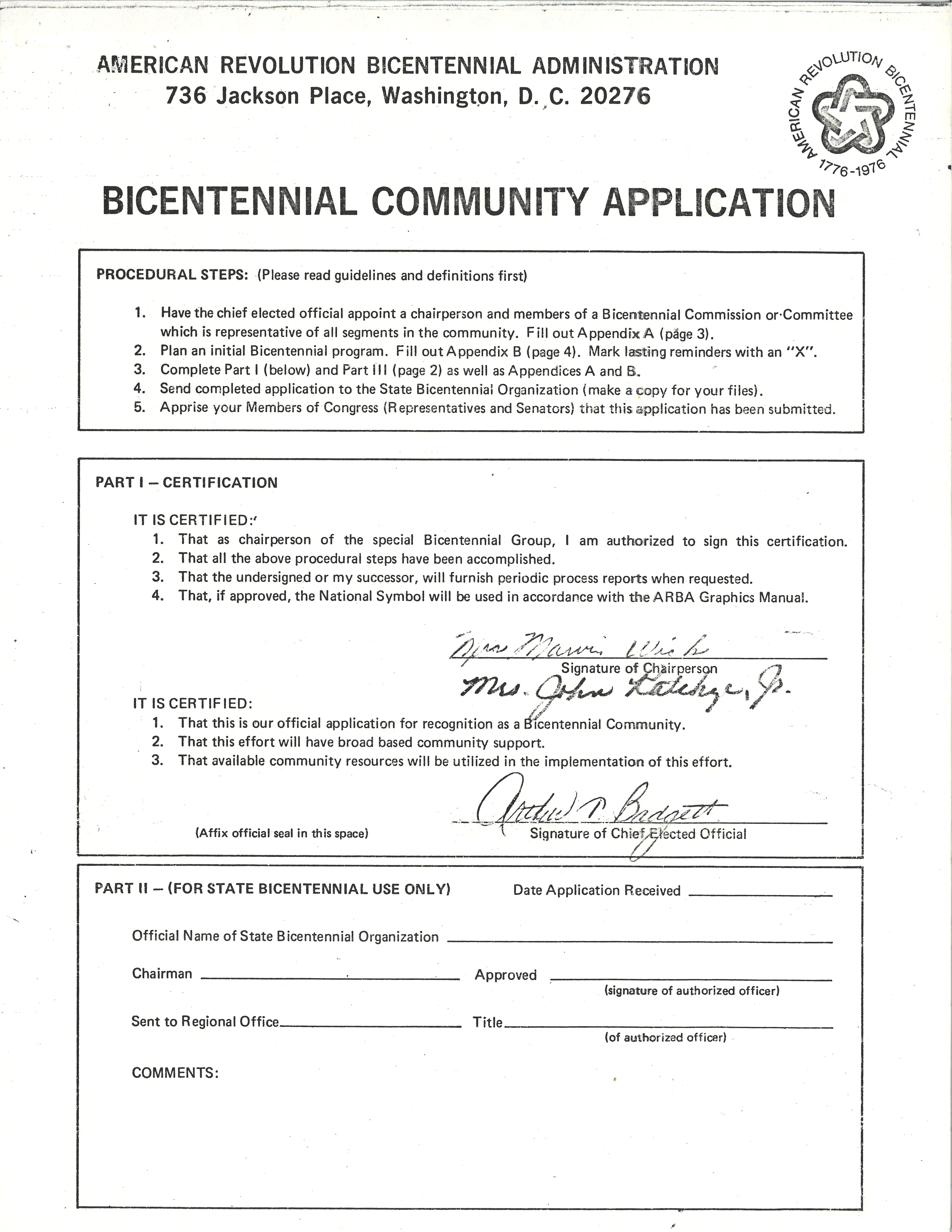 This is the application submitted by Dayton, Wyoming to the American Revolution Bicentennial Administration. It includes a list of thirteen Bicentennial activities that the city envisioned undertaking.