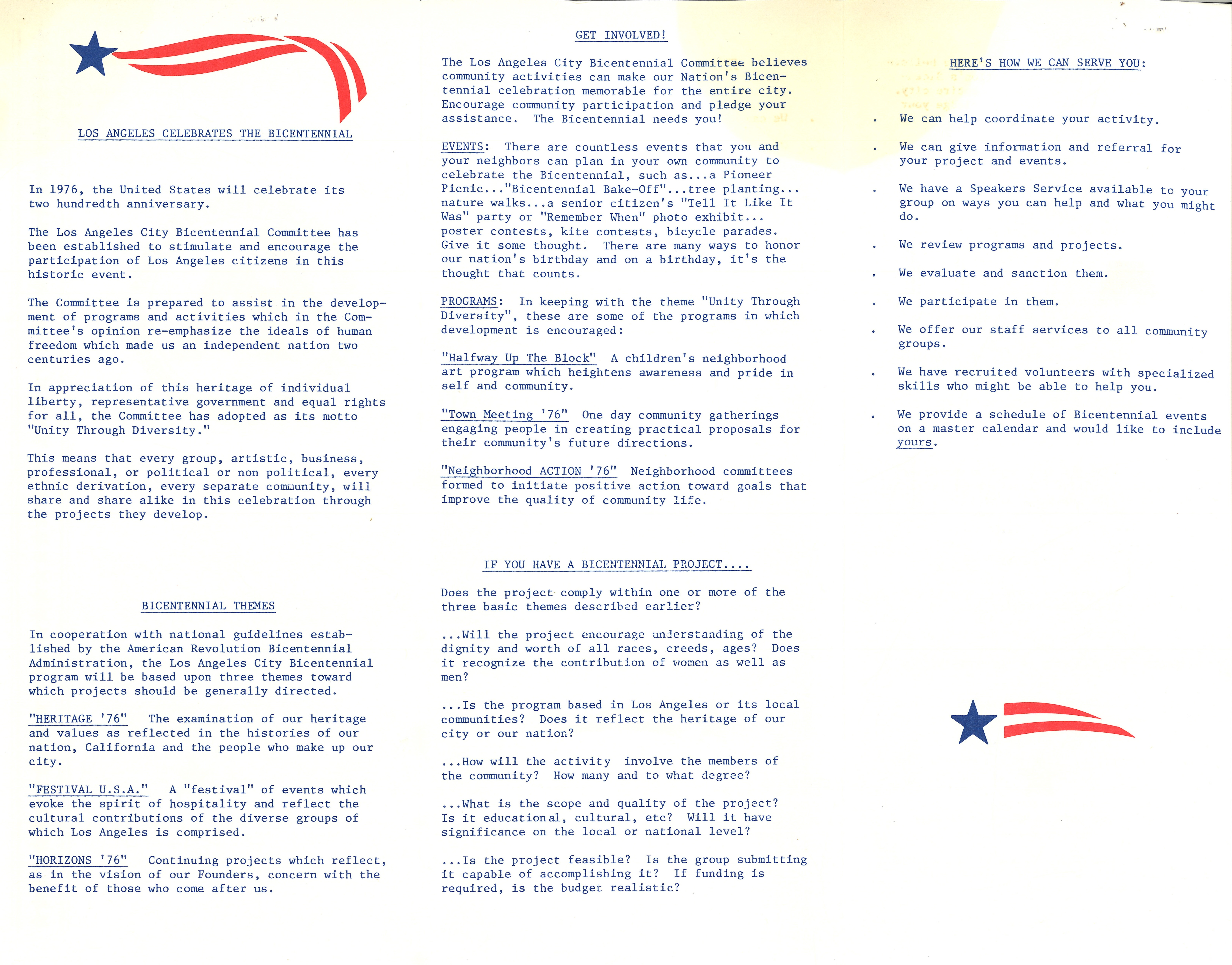 This pamphlet, distributed by the Los Angeles City Bicentennial Committee, introduces the committee and encourages community participation in planning for the Bicentennial.