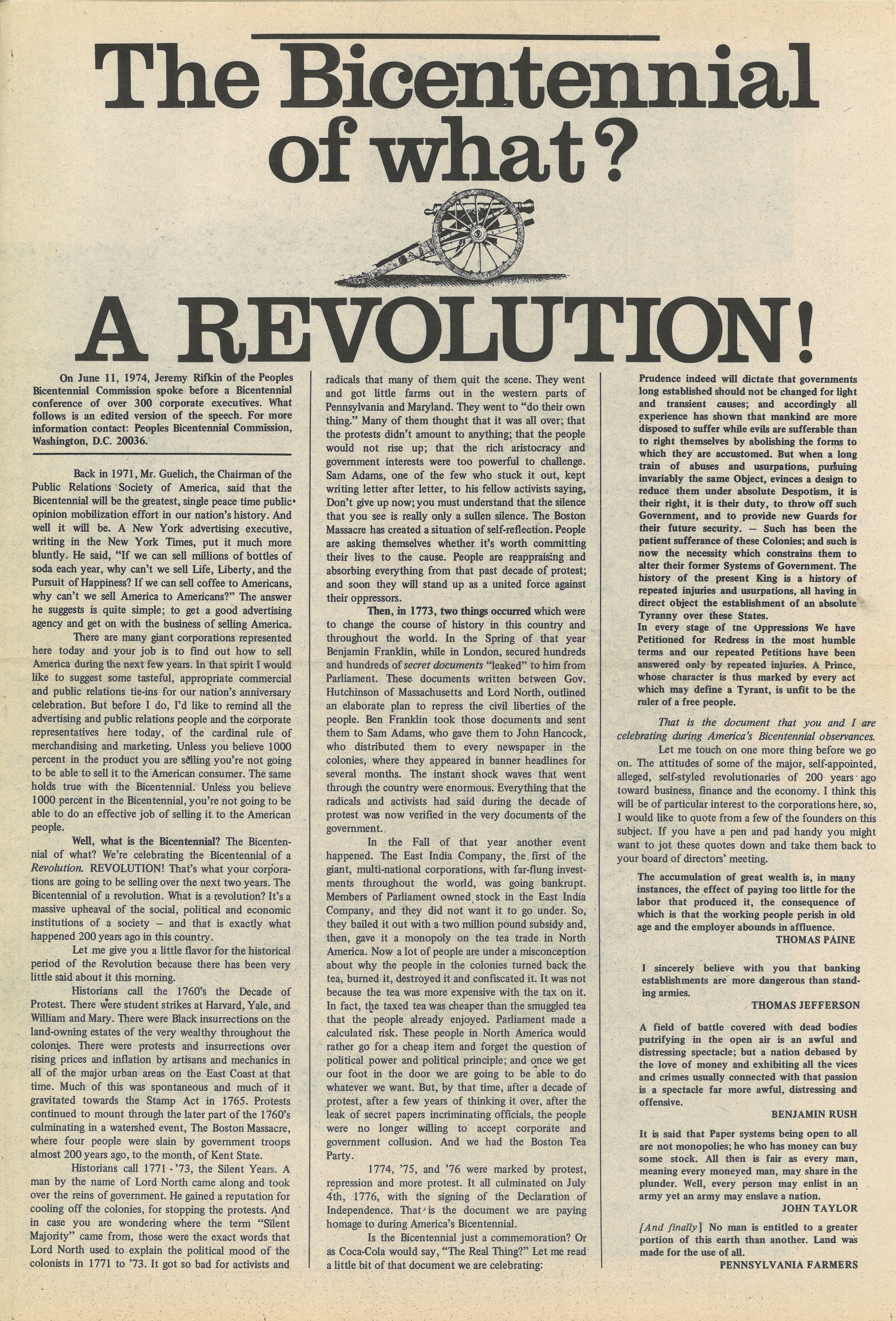 This article is an edited version of a speech by Jeremy Rifkin of the Peoples Bicentennial Commission. Rifkin challenges corporate leaders by reminding them that the American Bicentennial celebrates a revolution against tyranny and economic injustice—not a marketing campaign. He argues that modern corporations betray the democratic values of 1776 by prioritizing profits over people and calls for a new grassroots movement to restore true economic and political freedom.