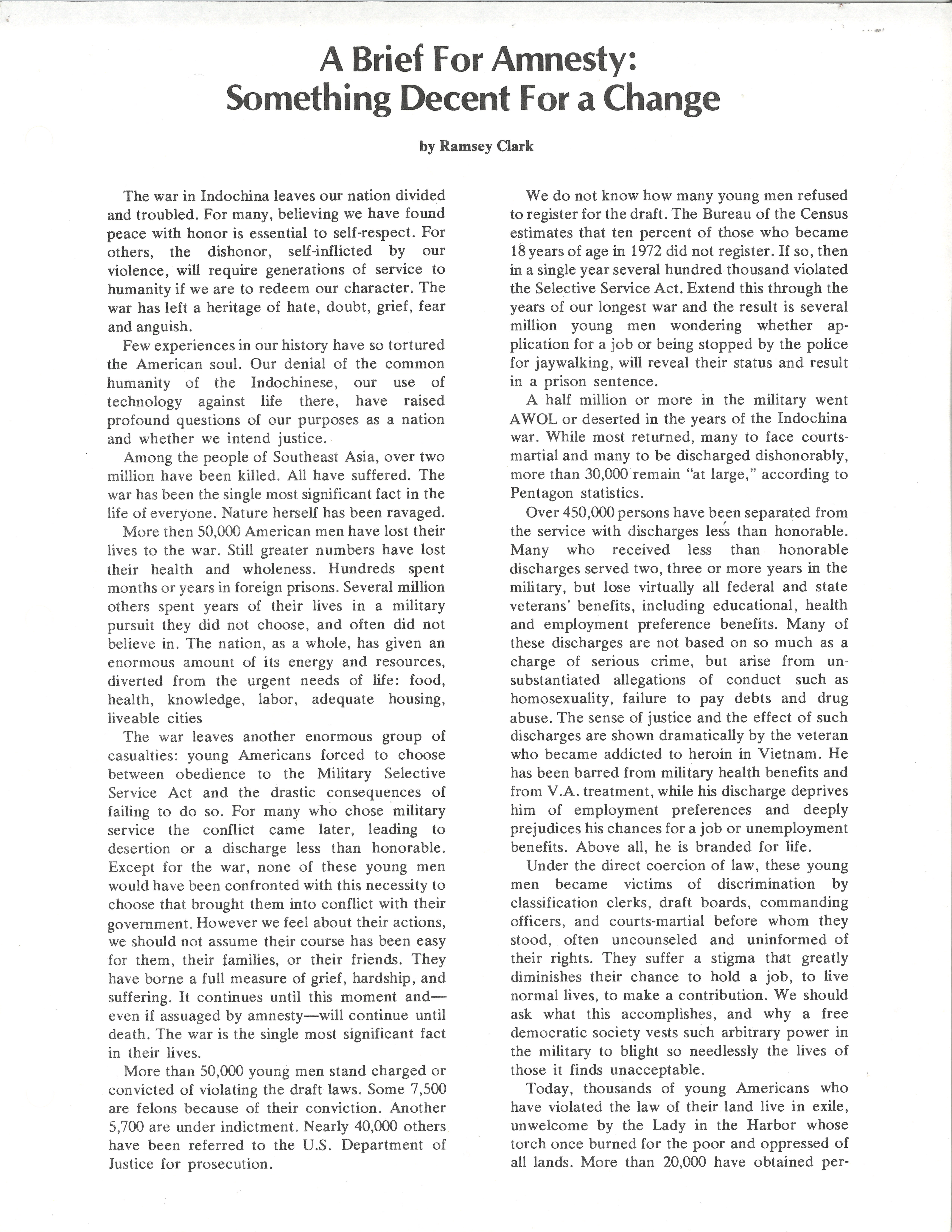 This article was written by Clark, who was the U.S. Attorney General under the administration of President Lyndon B. Johnson. In it, Clark points out that the Vietnam War left deep wounds for both Southeast Asians and Americans, including many young men punished for resisting the draft, deserting, or receiving less-than-honorable discharges. Clark explains that these men, along with their families, still suffer from stigma, lost opportunities, and exile. He calls for full and unconditional amnesty.
