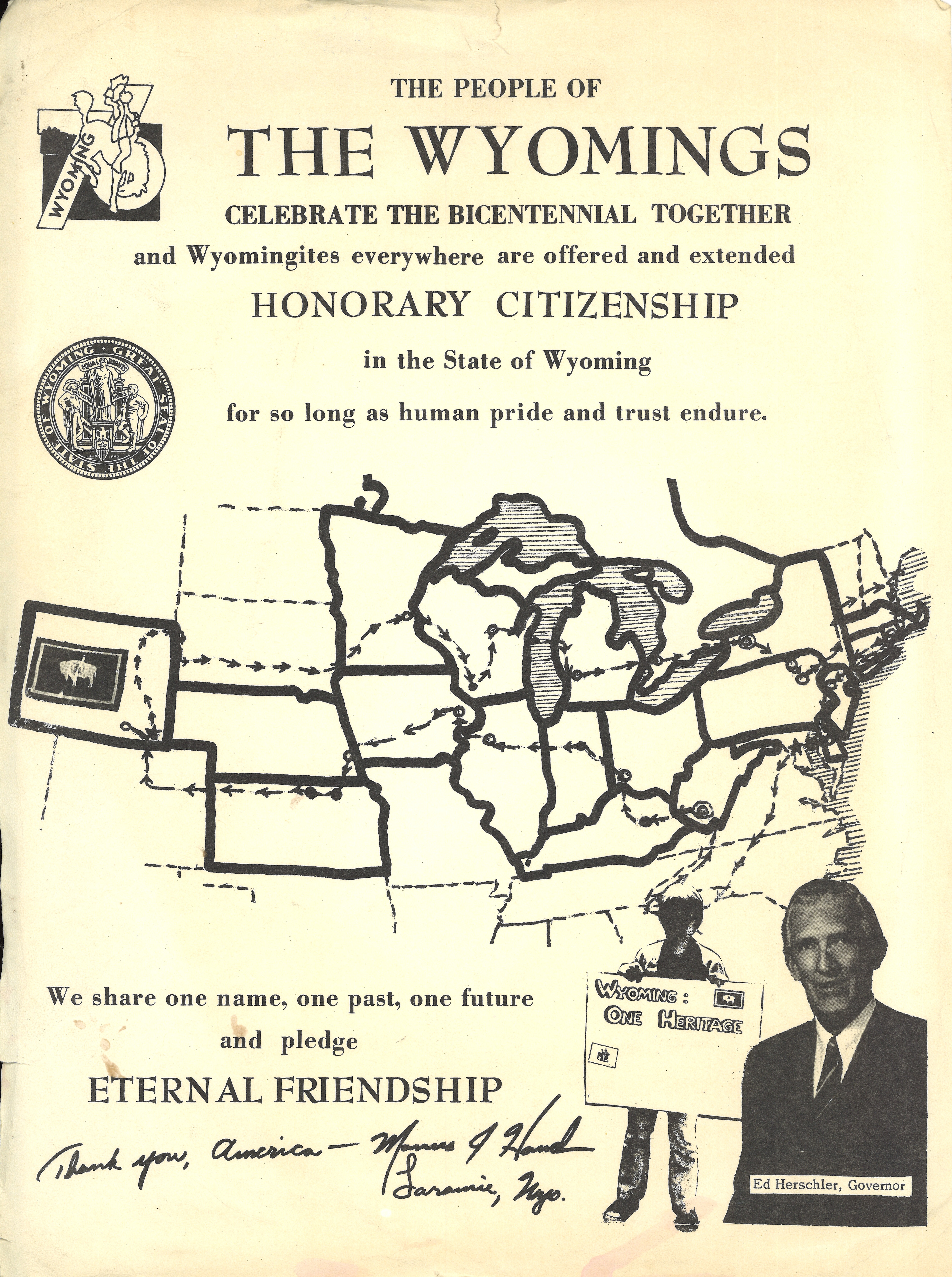 This certificate was given by Manus Hand to the leaders of the "Wyoming" communities he visited on his Bicentennial trip. The map shows the route the Hand family traveled.