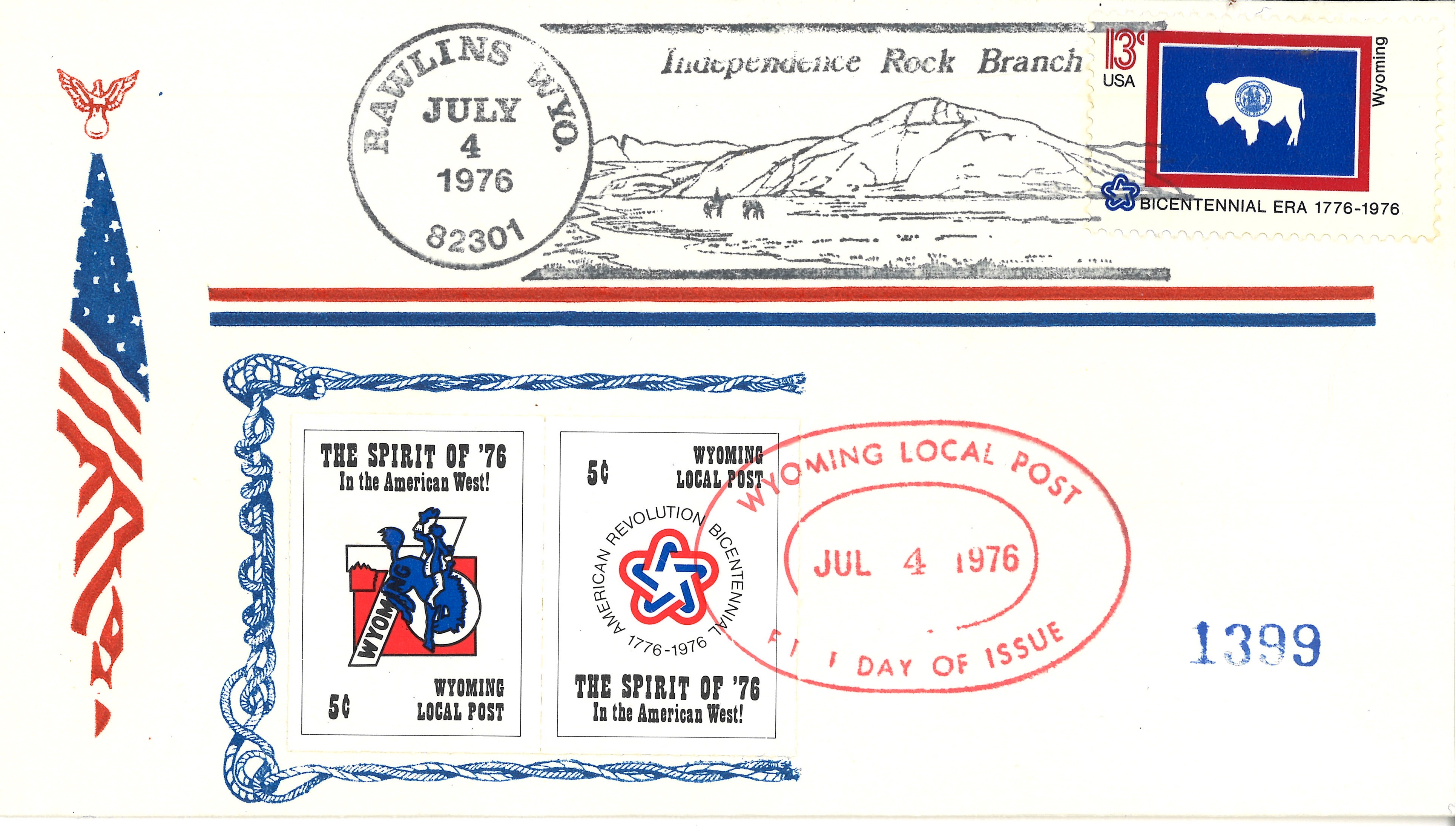 This commemorative envelope was stamped on July 4, 1976 with two special issue Wyoming postal stamps.