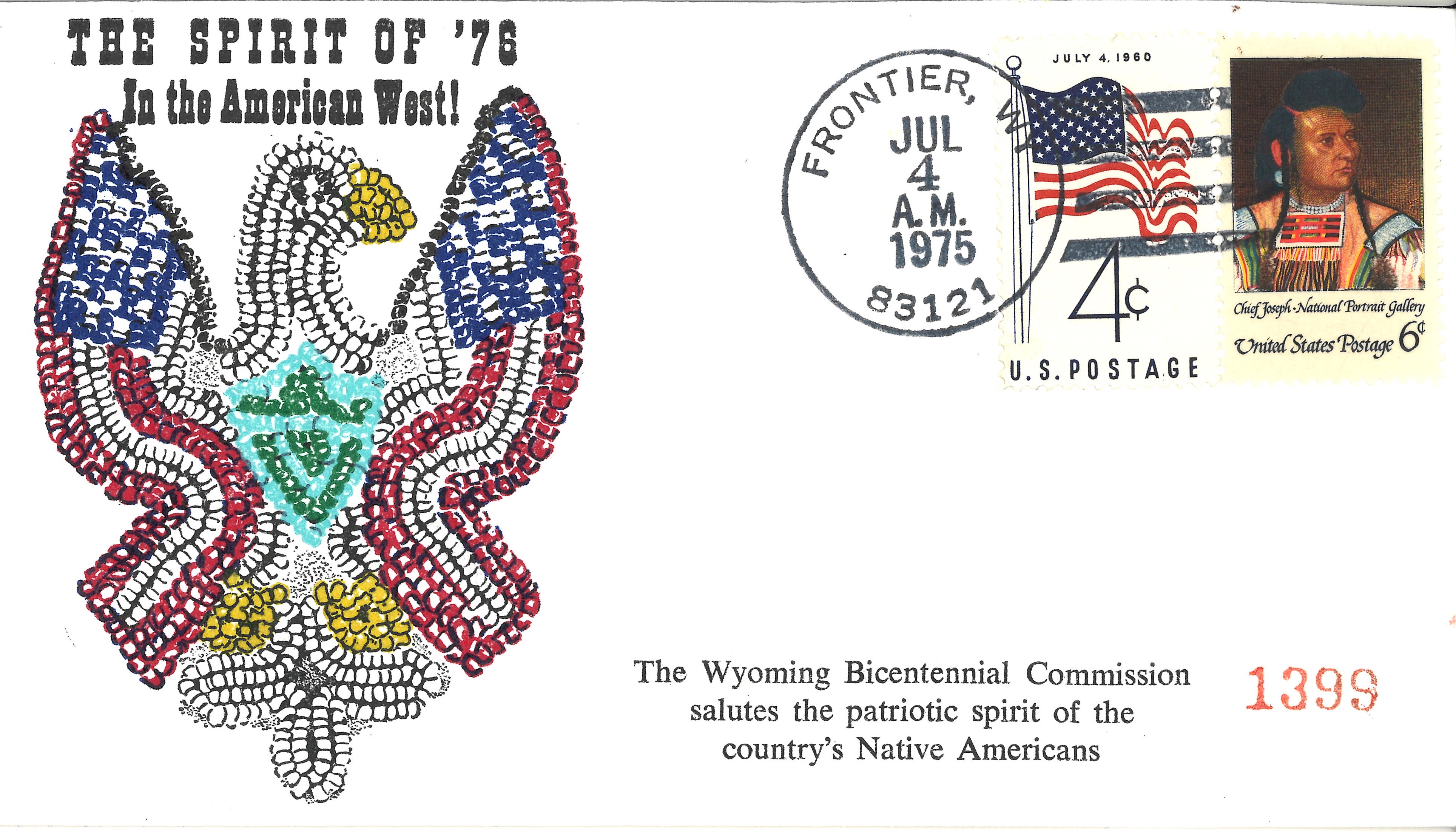 This commemorative envelope was stamped on July 4, 1975 and was issued by the Wyoming Bicentennial Commission honoring Native Americans.