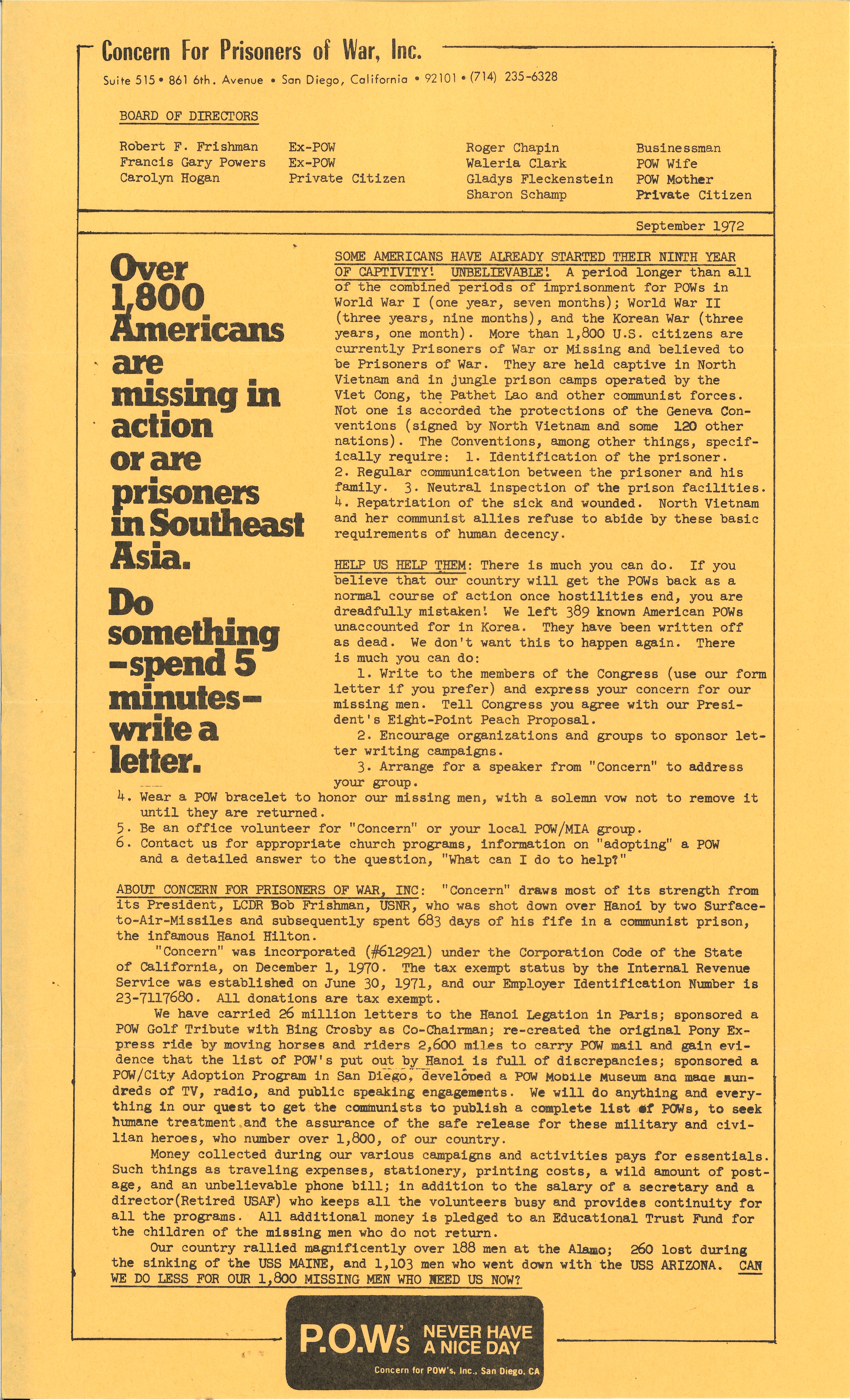 This flyer from the Concern for Prisoners of War organization outlines action Americans can take in support of prisoners of war. The organization's leadership includes two former prisoners of war.