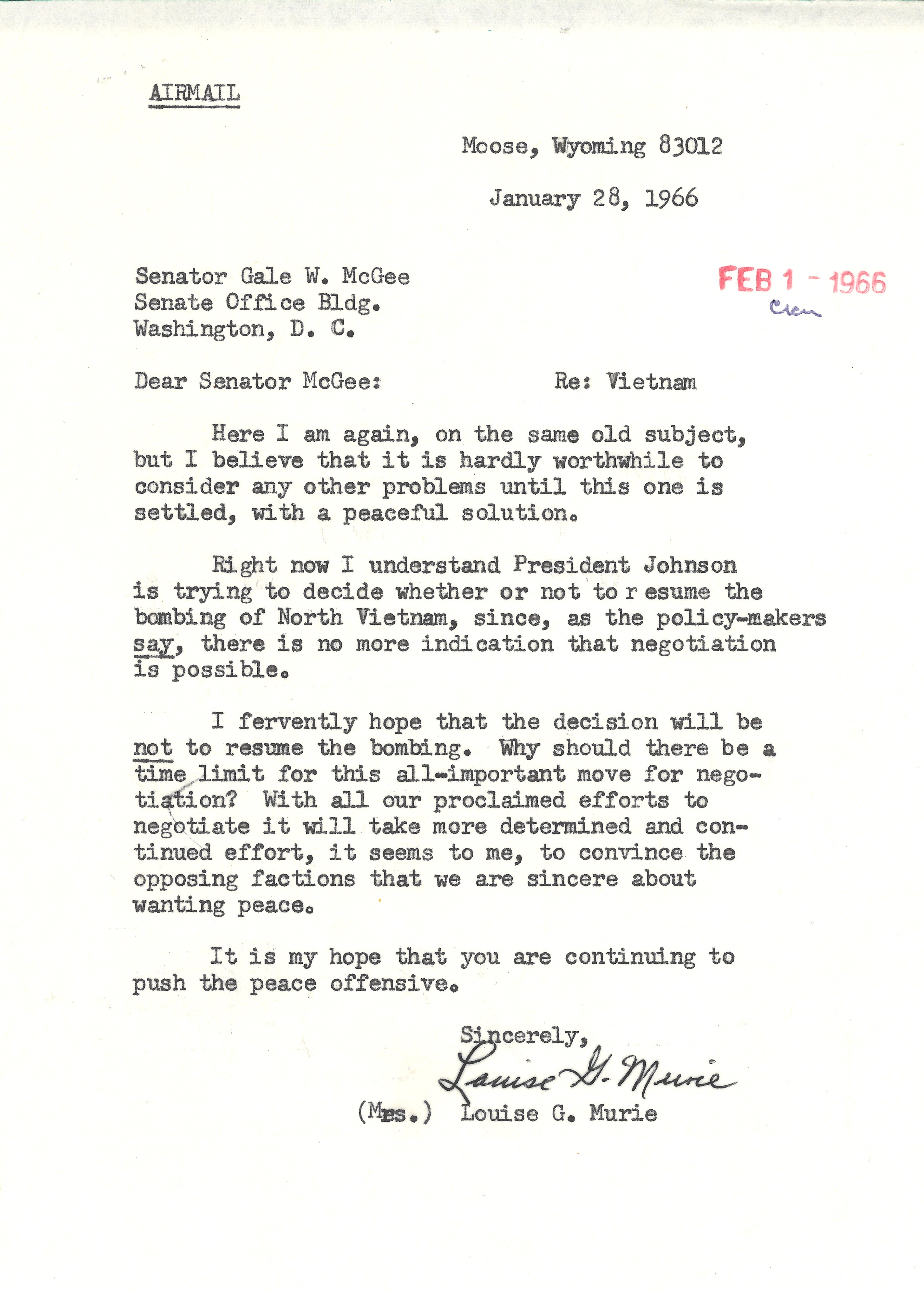 Murie writes to McGee urging him to pursue peace with Vietnam. McGee replies, saying that while he opposes reckless bombing of cities, he believes limited strikes to stop supplies and aggression are necessary, and predicts that peace would likely come only slowly after long, difficult fighting.