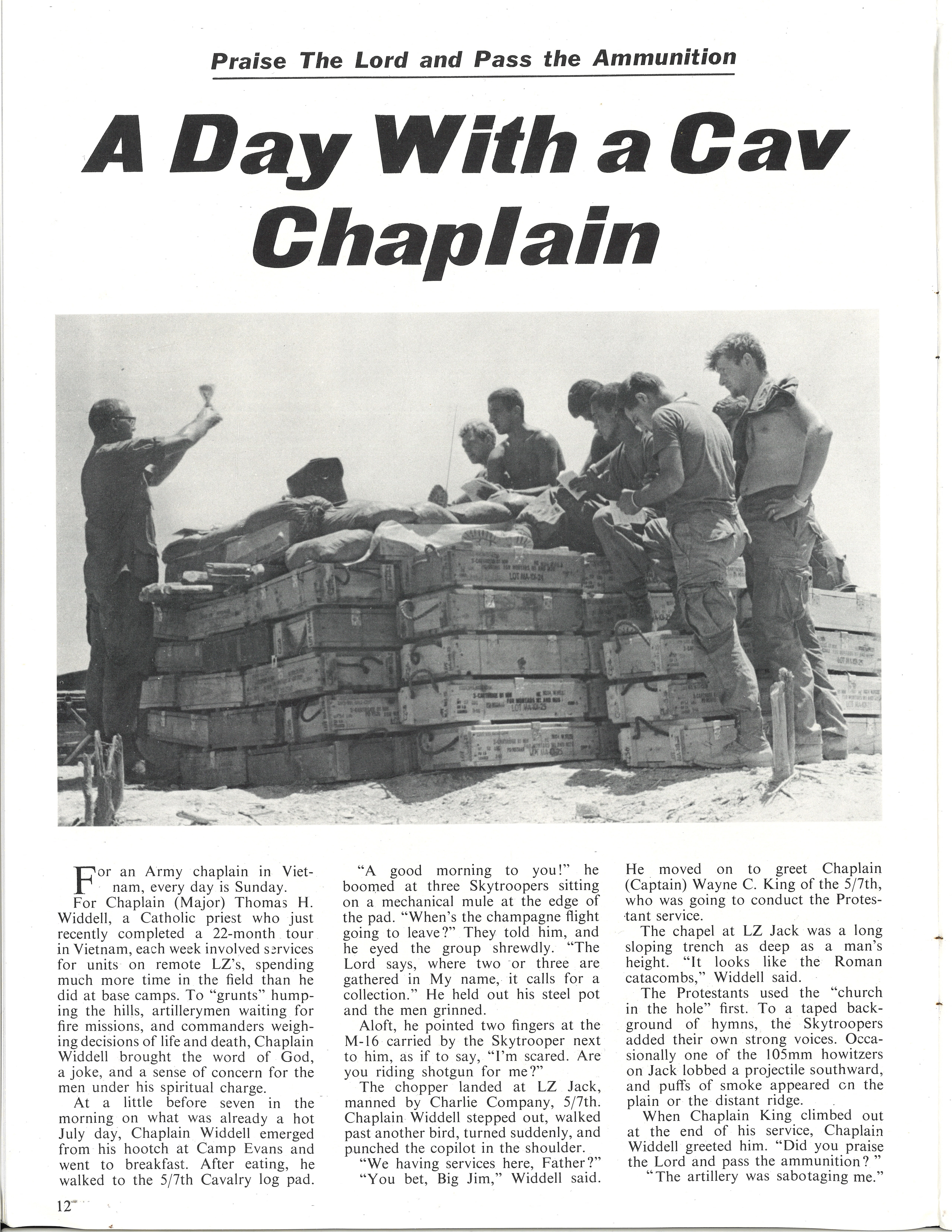 This magazine article follows Chaplain Major Thomas H. Widdell, a Catholic priest, as he travels across Vietnam to hold church services for soldiers in remote and dangerous locations. He balanced leading Mass with listening to soldiers’ worries, sharing jokes, and offering comfort in the middle of war zones.