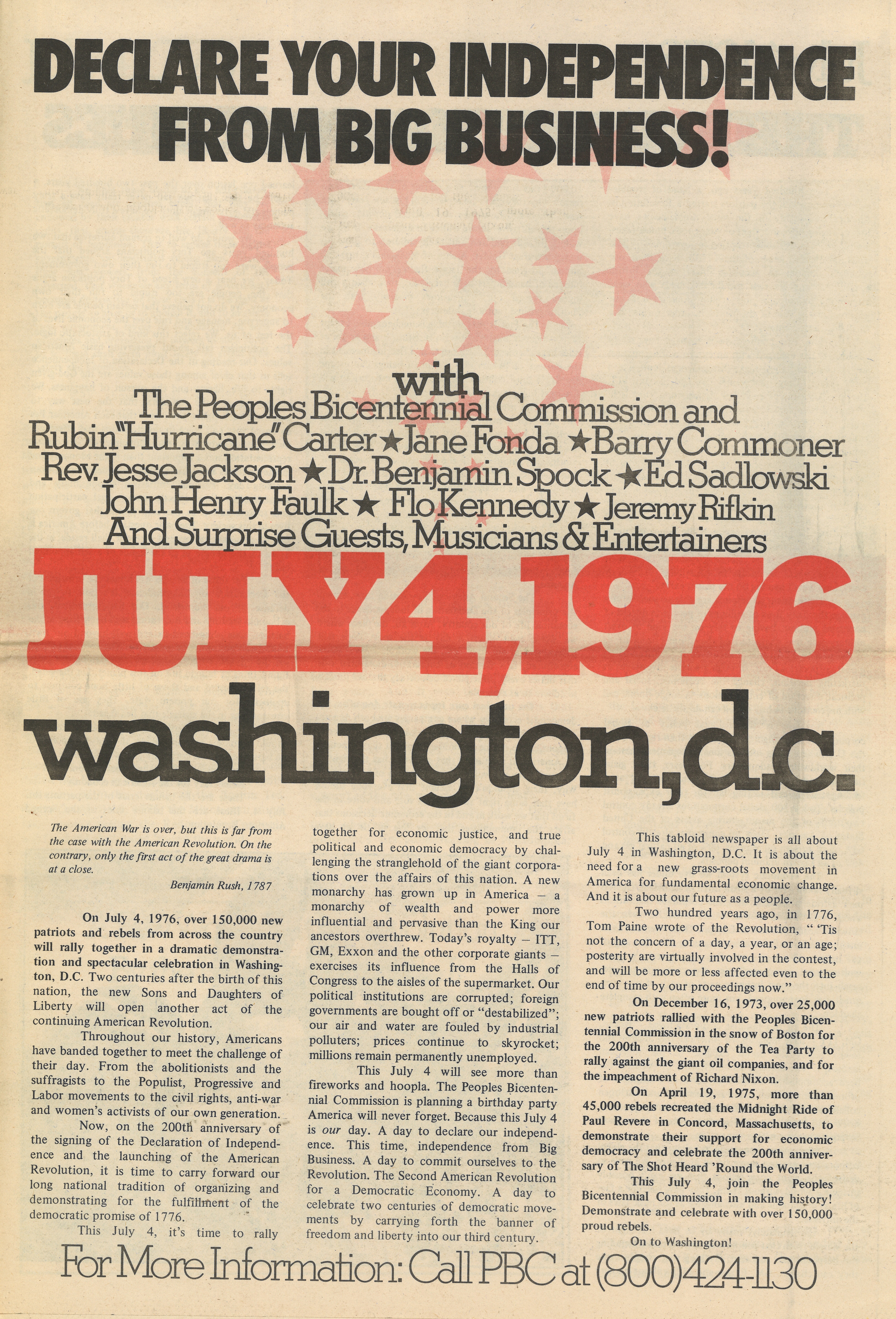 This paper was distributed by the Peoples Bicentennial Commission. It calls for people to gather in Washington, D.C. on July 4, 1976, to protest the power of large corporations and demand a more democratic economy. It compares modern corporate control to the tyranny faced during the American Revolution and urges citizens to take action as part of a “Second American Revolution” for economic justice.